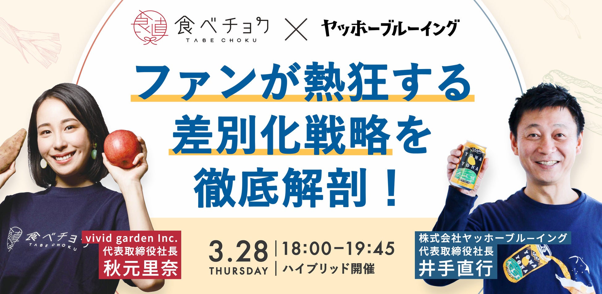 認知度・利用率など9つのNo.1(※1)を持つ日本最大の産直通販サイト「食べチョク」を運営する株式会社ビビッドガーデンの秋元里奈と、よなよなエールで知られる株式会社ヤッホーブルーイングの井手社長による対談企画「ファンが熱狂する差別化戦略を徹底解剖!」が3月28日 (木) に開催決定。食品、酒造、加工品メーカー等の経営者向けに、参加申し込みの受け付けを開始しました。消費者意識の多様化や、原材料・物流費の上昇に伴う値上げにより、飲食料品をめぐる市場環境がかつてなく厳しい今、いかにファンに愛される事業・ブランドを創り差別化を図るか。独自のクラフトビール文化を創り広げてきた井手氏と、一次産業の価値向上を実現する急成長スタートアップの秋元の両代表が、自ら語る企画です。エントリーフォーム:https://yonayona-tabechoku.peatix.com/エントリー締切:2024年3月27日(火)・日時:2024年3月28日 18:00 - 19:45・場所:ハイブリッド開催(六本木ヒルズもしくは、オンライン視聴)