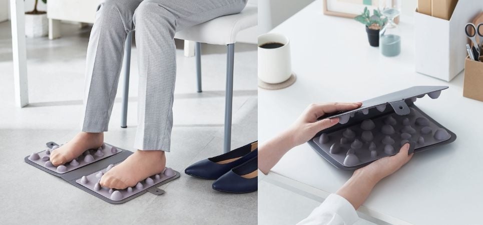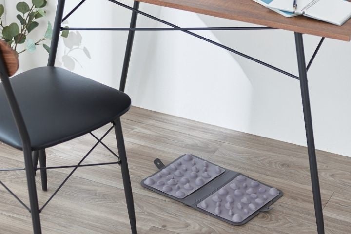 仕事中でも、こっそりリフレッシュ。仕事で忙しく、疲れた身体をケアする時間も取れない人に向けた、オフィスでも、お家でも、仕事をしながらでも、もちろんリラックスタイムにも、いつでもどこでも使いやすいヘルスケアグッズです。デスクの下でつぼ押しができ、リフレッシュできる足つぼマットです。