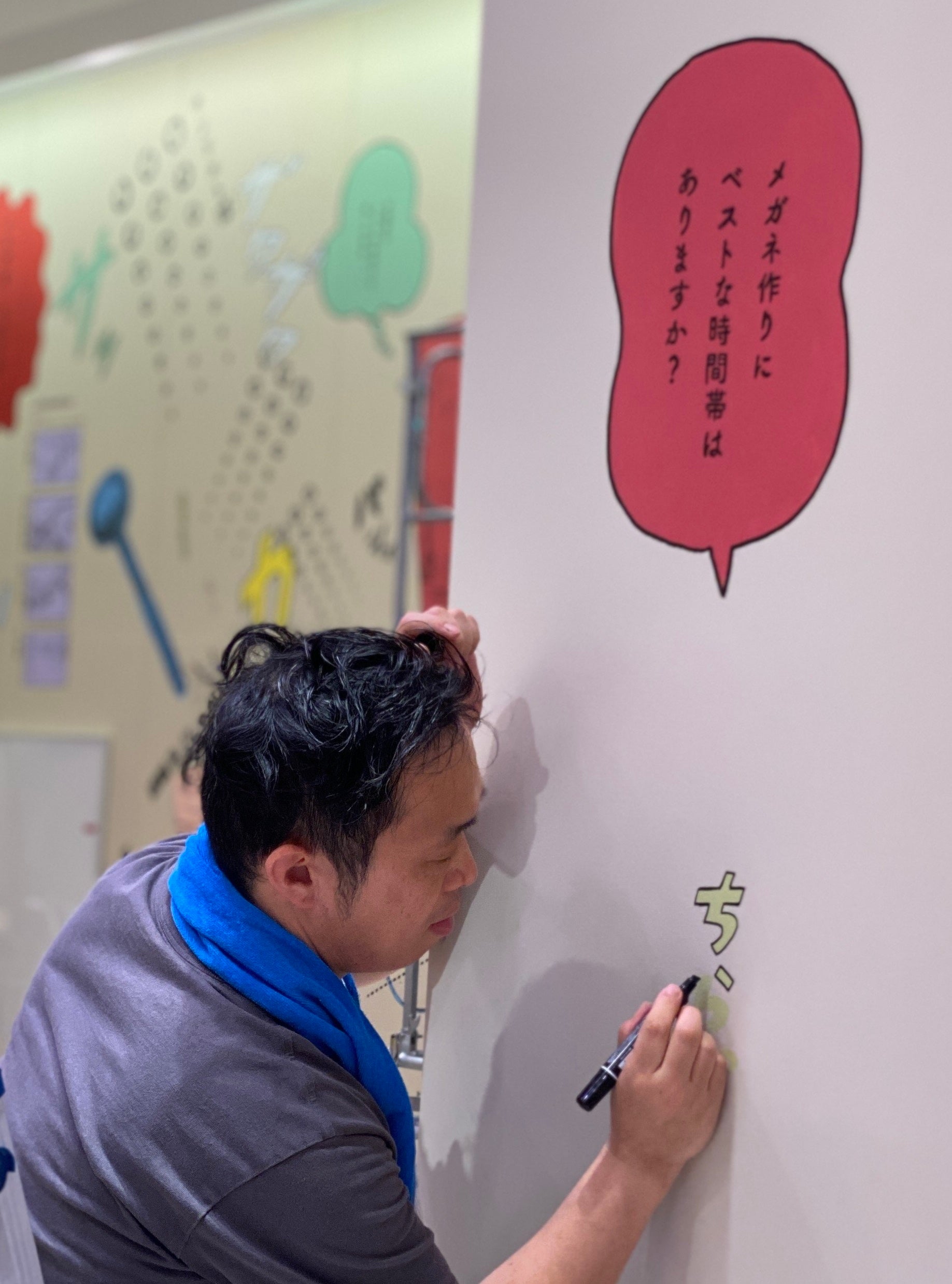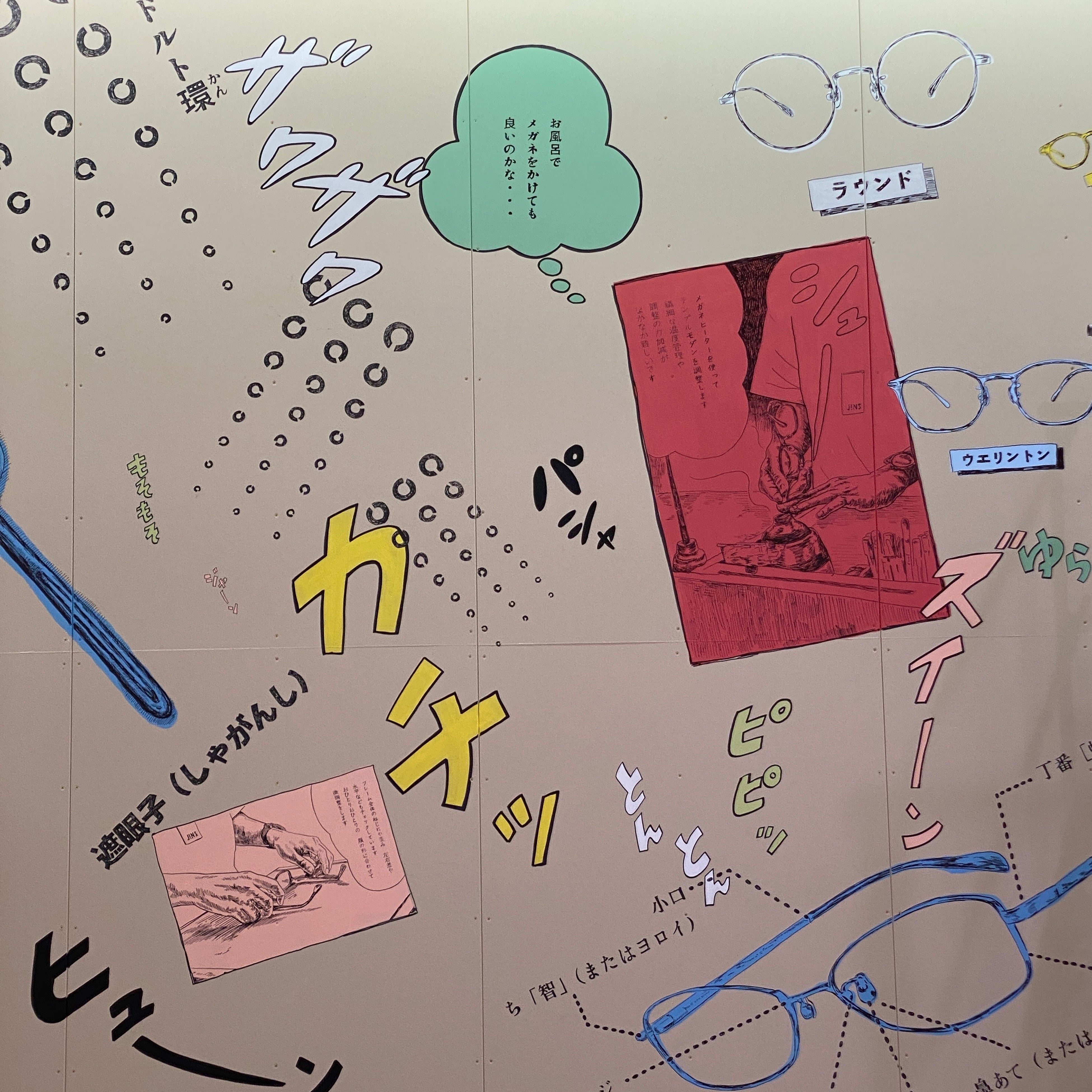 店内の壁面には、地元太田市出身のアーティスト・尾花賢一氏のオリジナル作品を展示します。「おしゃべりな壁」をテーマに描いたドローイング作品には、待ち時間にも気づきやひらめきが生まれ、豊かな体験につながって欲しいという想いが込められています。作品は、メガネの豆知識や店舗スタッフの作業風景、メガネに関連する心理描写をコラージュのように構成。オノマトペやセリフを盛り込むことで、まるで壁一面が漫画の1ページとなり、引き込まれるような作品になっています。何気ない風景の描写一つひとつに込められた物語がワクワクする時間と賑やかさを演出します。