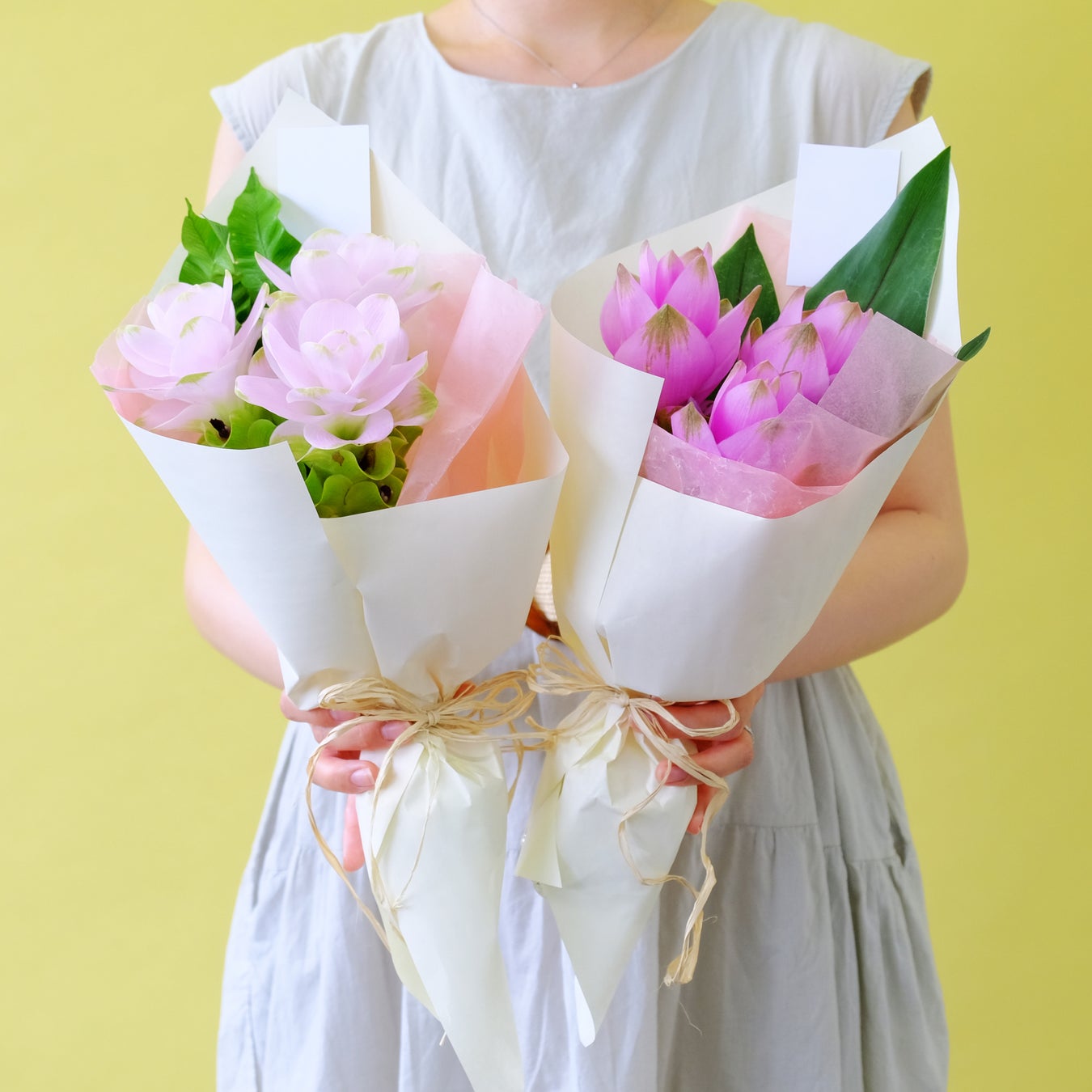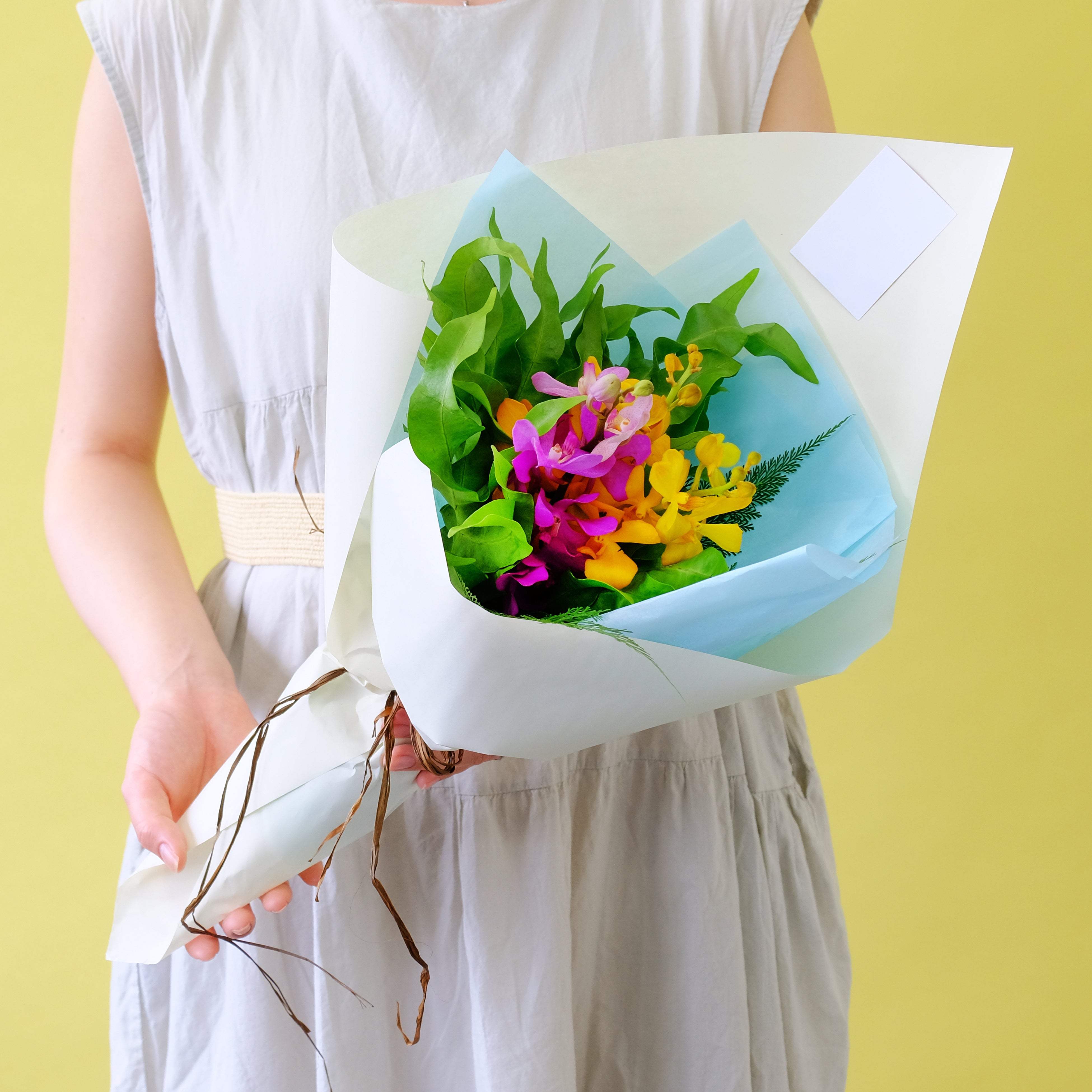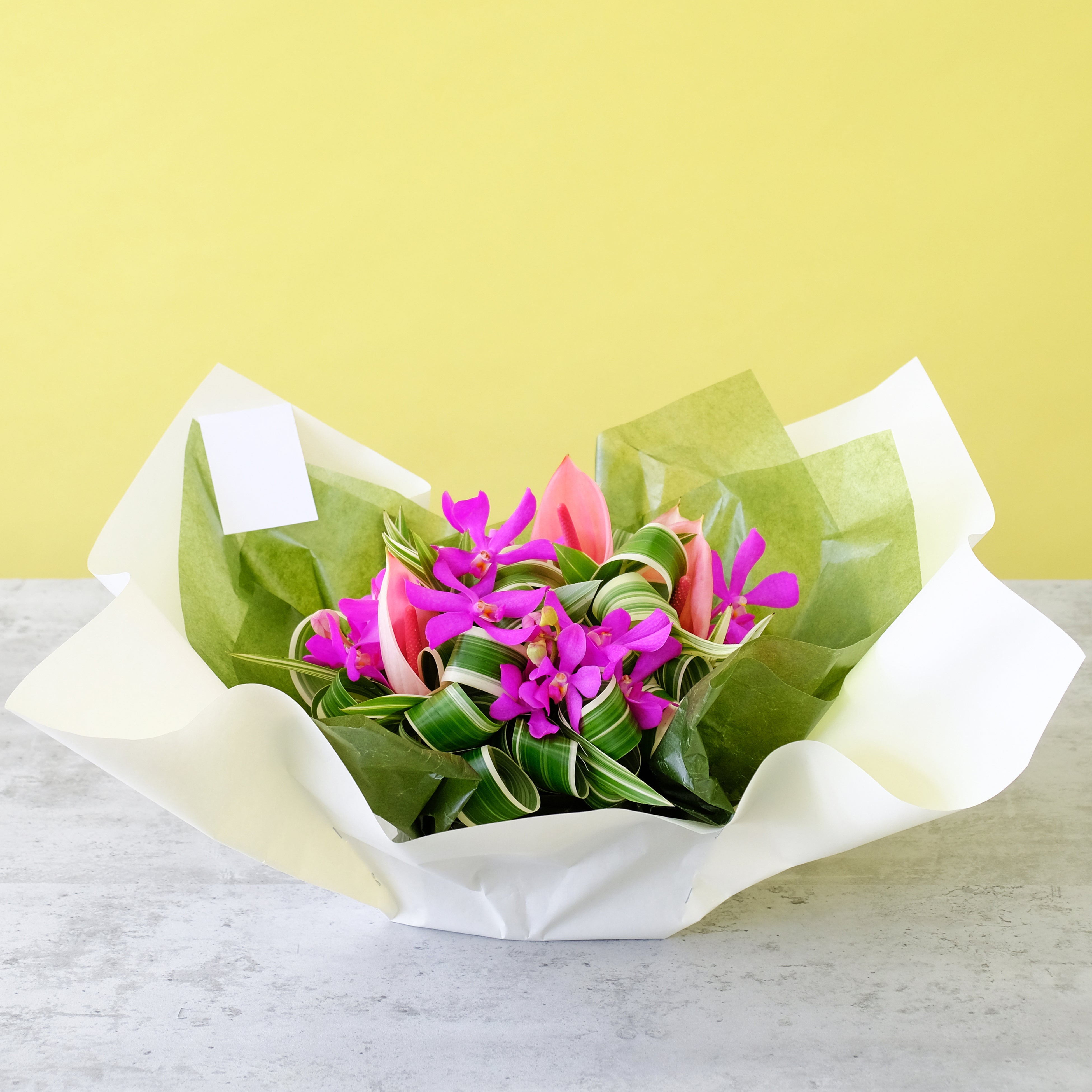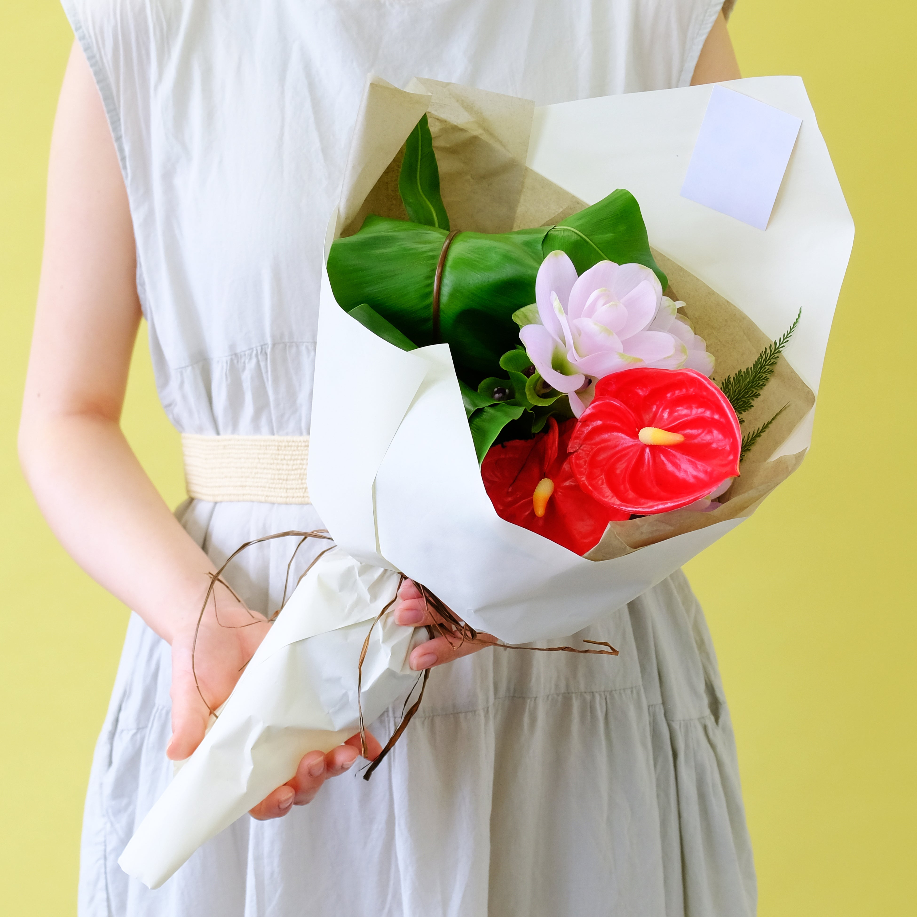 ショップおすすめのトロピカルフラワーをシンプルなブーケに仕上げました。持ち運びしやすいコンパクトサイズなので、気軽なギフトやご自宅用にぴったりです。