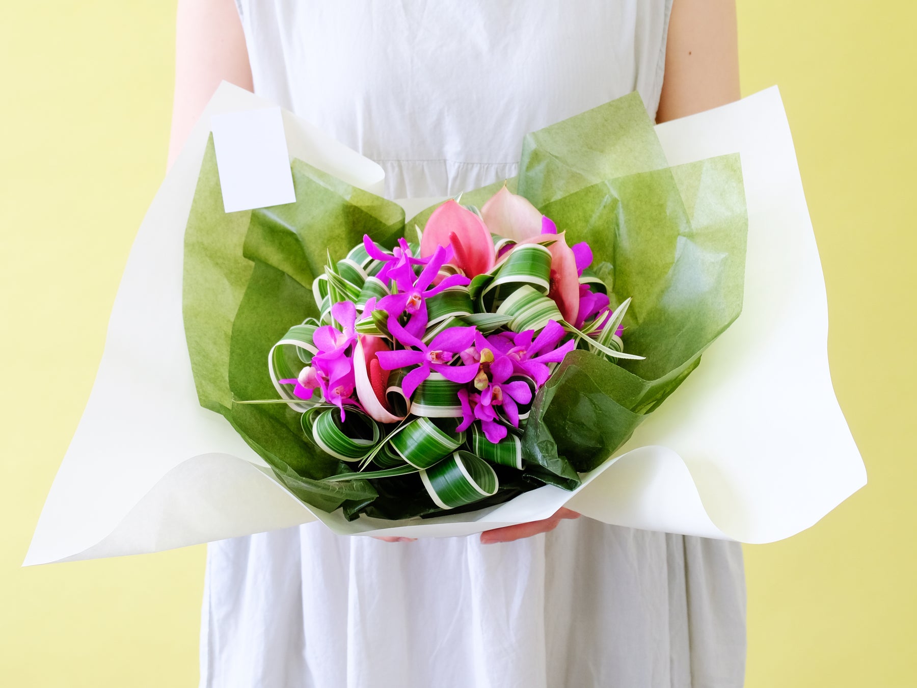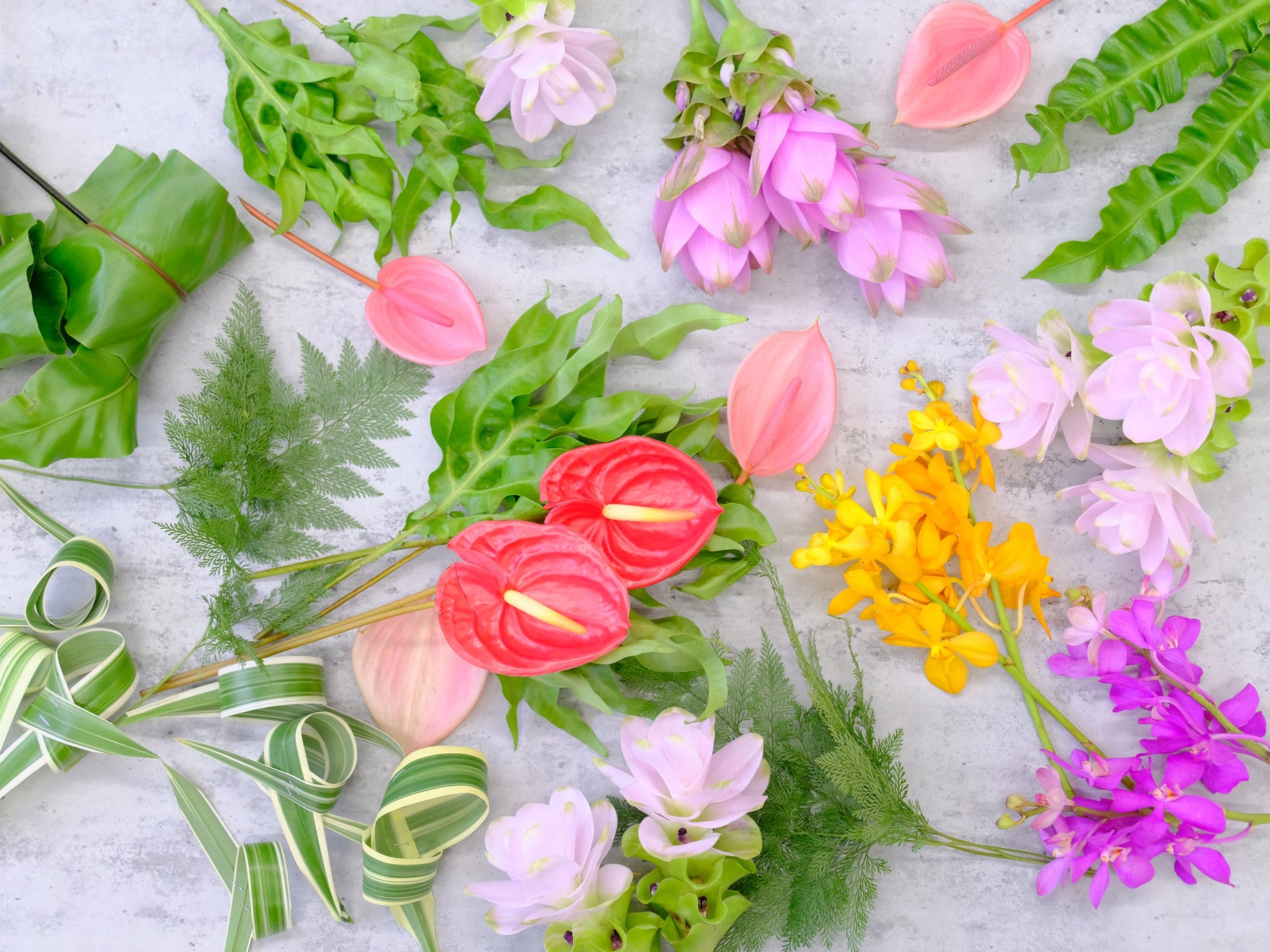 真夏のリゾートホテルに飾るようなイメージで、トロピカルフラワーを使ったブーケやアレンジメントをデザインしました。飾っていただくときにも、ラッピングをほどいて花瓶に生けていただくだけで、まるでホテルに飾ってあるような雰囲気に見えるように工夫しています。なにより、トロピカルフラワーは真夏にも強いので、花の傷みを気にせず飾れるのもうれしいポイントです。ぜひ、夏感いっぱいの花をプレゼントやご自宅用にお楽しみください!