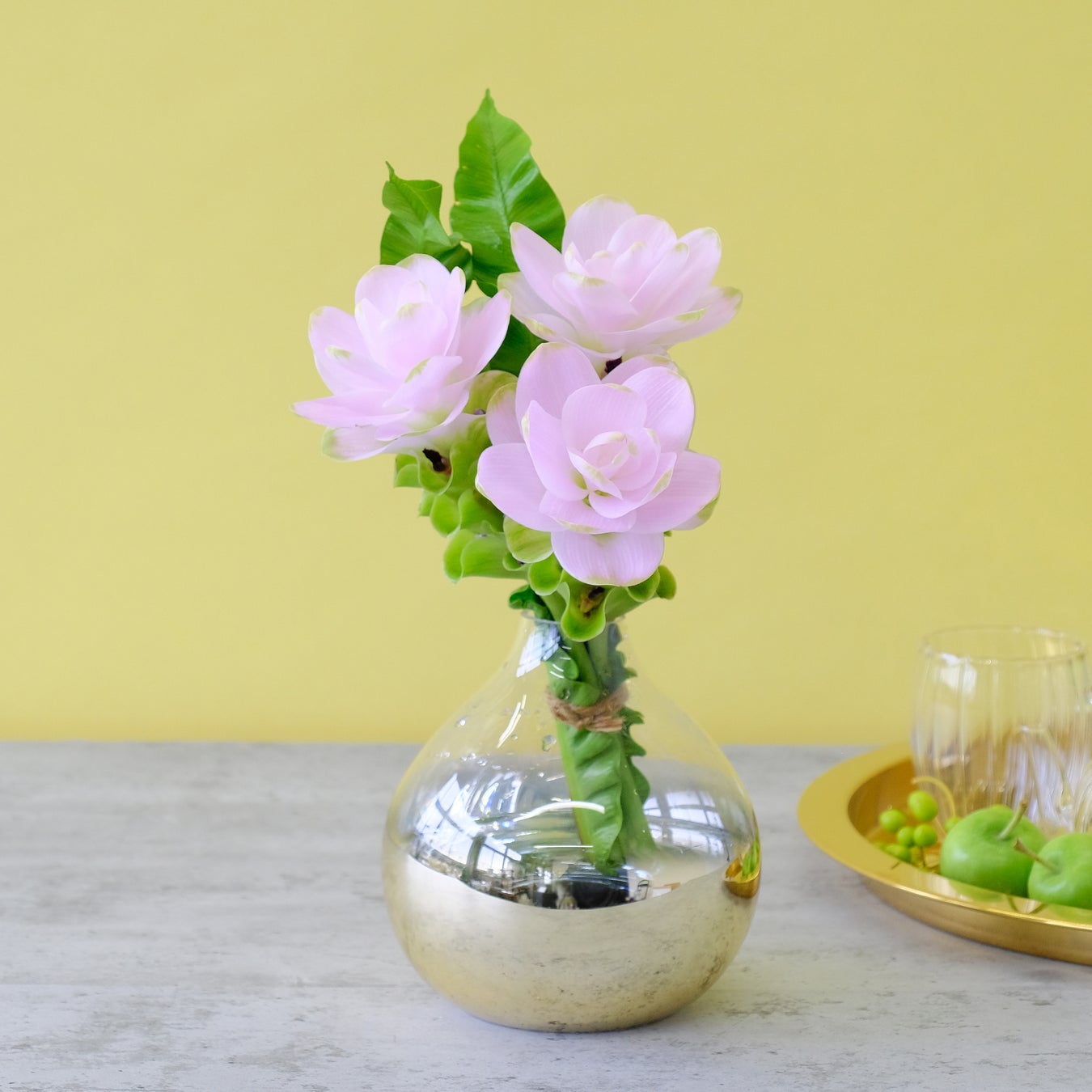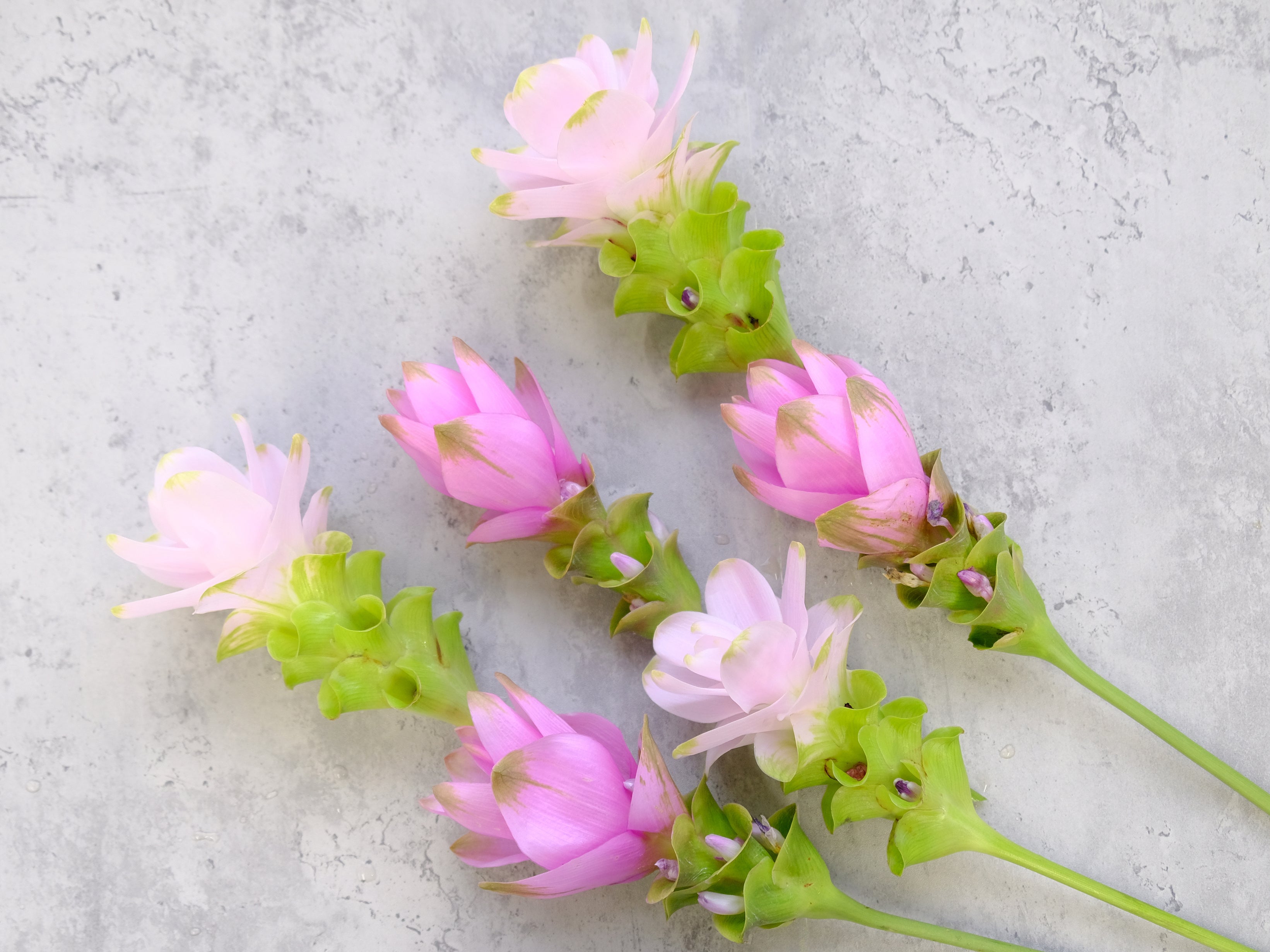 サプリメントやスパイスとして身近なウコンの仲間です。花に見える部分は苞と呼ばれる、葉が変形した部分で、本来の花は苞の間に小さく咲きます。また、クルクマ属の仲間には鑑賞用の他にも、食用・薬用として利用される種類が多く存在します。根の内部は黄金色で、このことからアラビア語の「kurkum(黄色)」が語源となり、この名が付いたとされています。