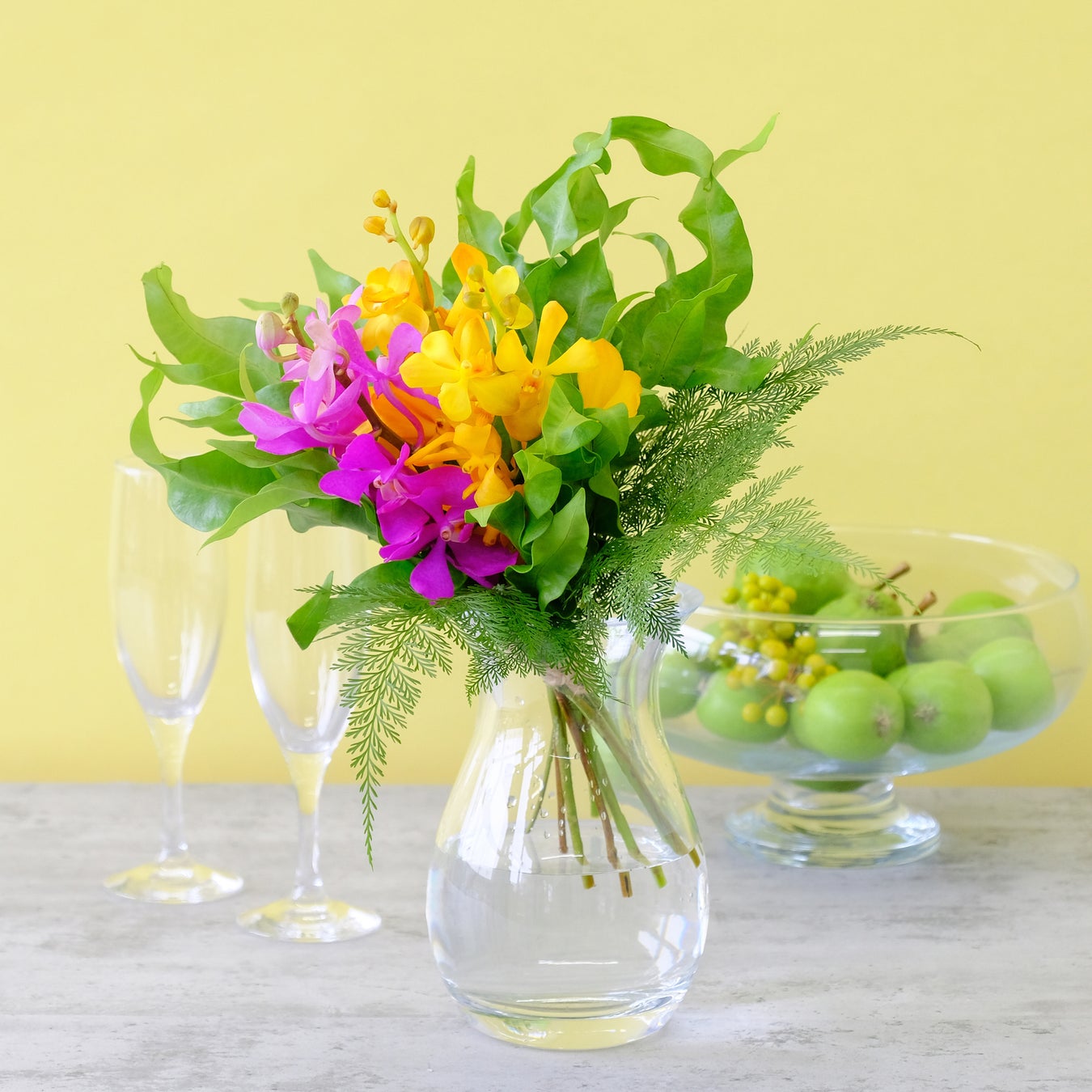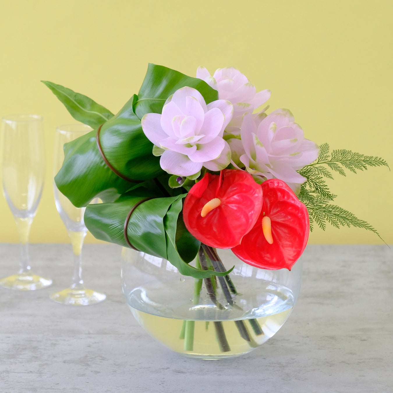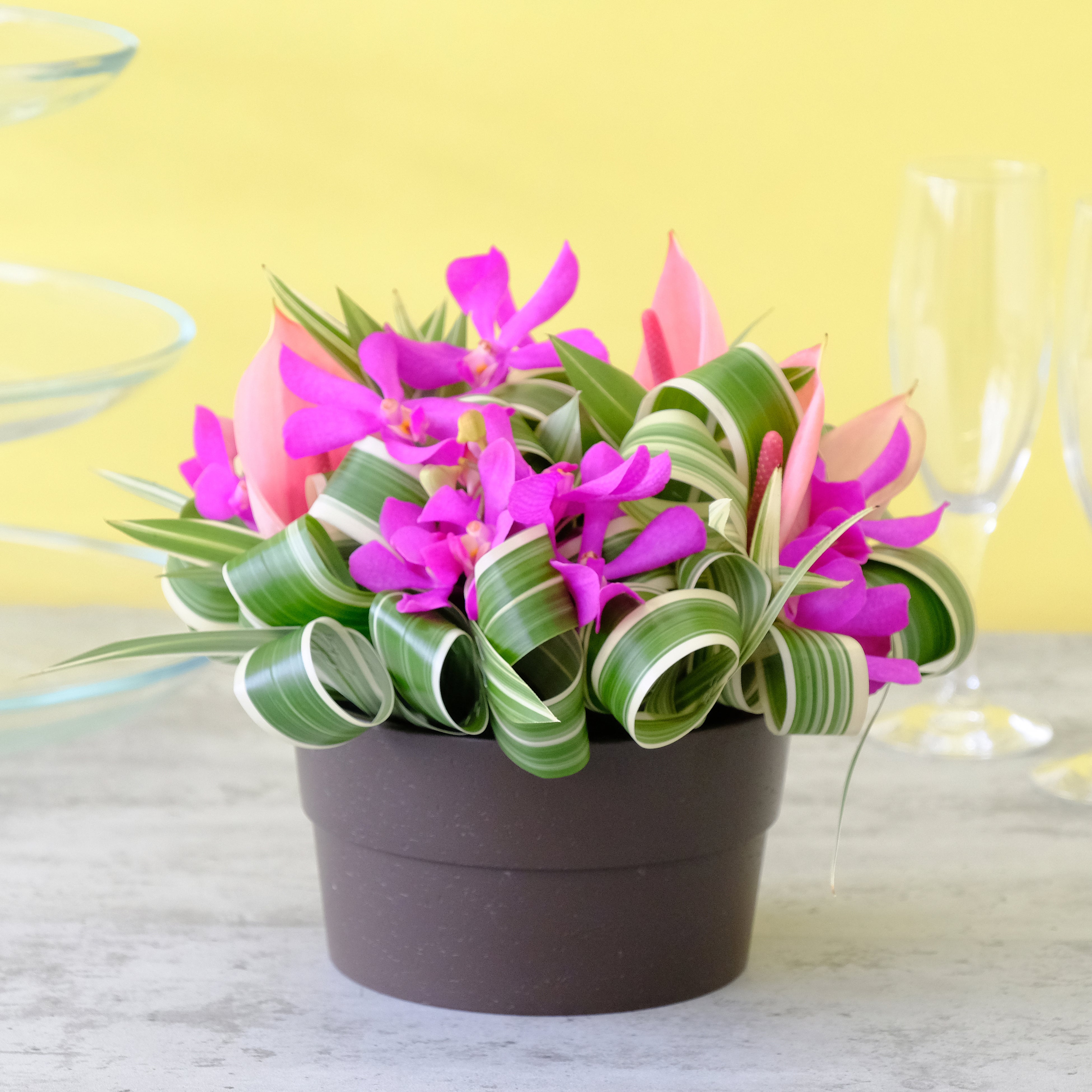 ショップおすすめのトロピカルフラワーをモダンなアレンジメントに仕上げました。器付きのためそのまま飾って楽しめます。