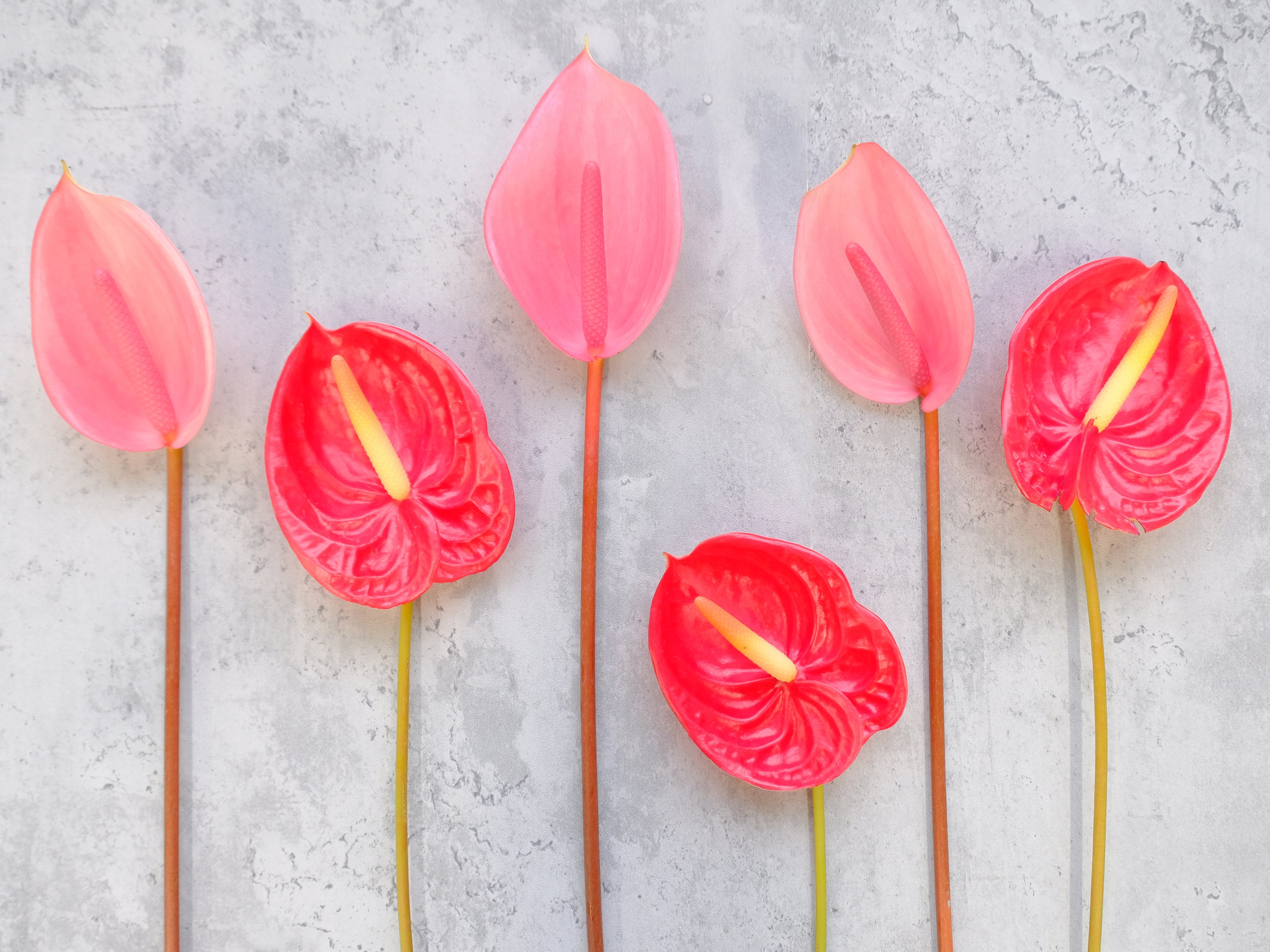 アンスリウムはカラーやミズバショウと同じサトイモ科の植物で、同じような見た目の特徴を持った花です。最も特徴的な中央の突起部分が「肉穂花序(にくすいかじょ)」で、小さな花が集まっているこの部分が本来の花。花だと思われがちな、ハート型をした大きな部分は葉が変化した「仏炎苞(ぶつえんほう)」です。