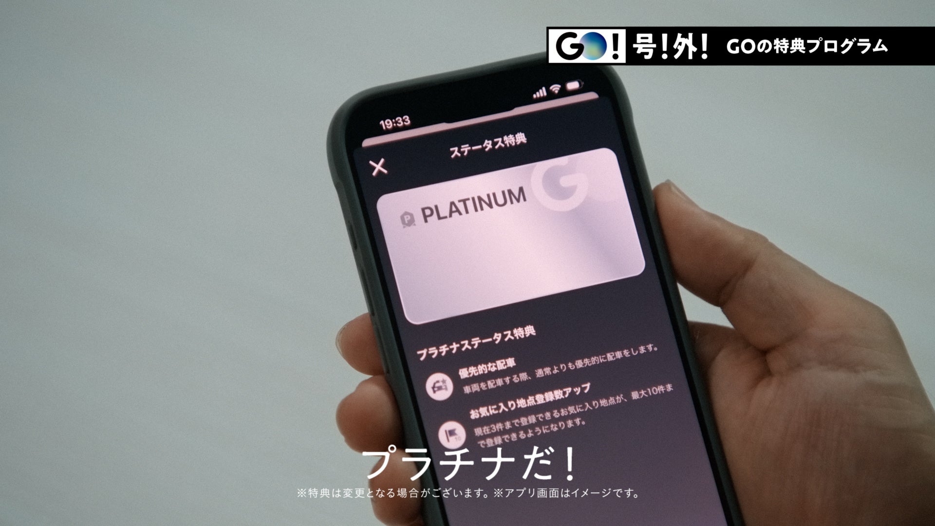 「特典プログラム」篇は、『GO』のご利用回数に応じて提供されるステータス特典※4を紹介する内容です。ステータスにはSTANDARD(スタンダード)、SILVER(シルバー)、GOLD(ゴールド)、PLATINUM(プラチナ)があり、『GO』を利用すればするほどステータスが上がり配車されやすくなると聞いて、驚く加藤リポーター。「プラチナが一番上っていうことですか?」と切り込んでいく加藤リポーターの様子にもご注目ください。