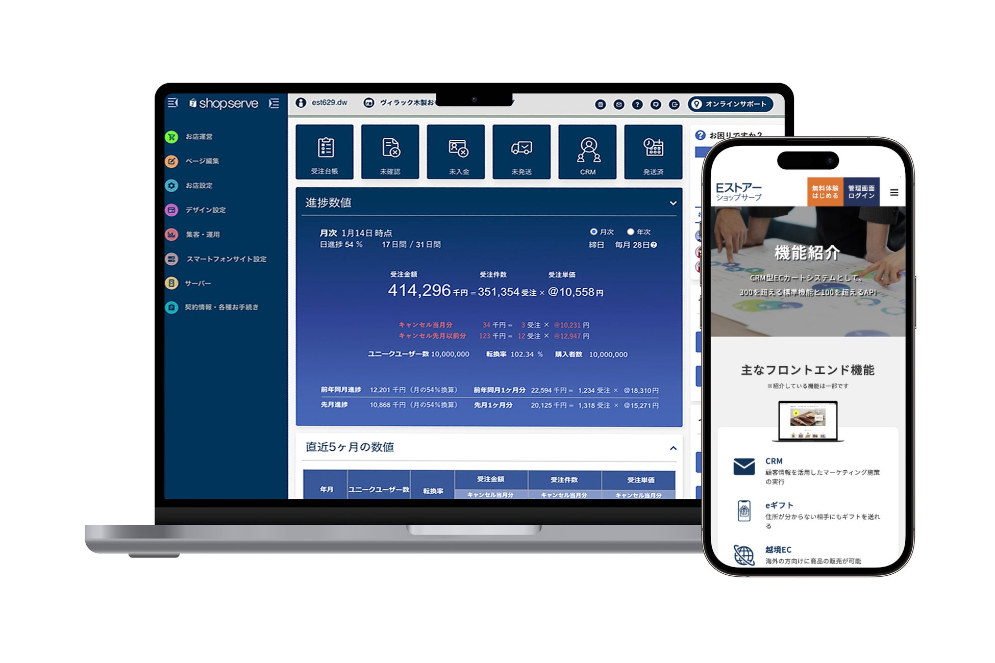 Eストアーショップサーブは1999年以来 、D2C専門、GMV1.5兆円、累計11万社のノウハウが凝縮されたECシステムです。専用構築に匹敵するレベルの回線を使用。SaaSという共用サーバーでは異次元とも言える、プレミアムクラスのインターネット回線を使用することにより、圧倒的な安定運転(ノーダウンタイム)を継続しています。また、いち早くTLSセンドグリッドメールを導入することで配信メールの高い到達率を実現し、業界最多のAPIにより著名な各種ツール・サービスともダイレクトに通信でき、カスタマイズ開発不要で、導入企業様のシステムとの即時リアルタイム接続が可能な柔軟なシステムです。また、専任担当とCRM機能でリピート強化、人手不足を解決できます。