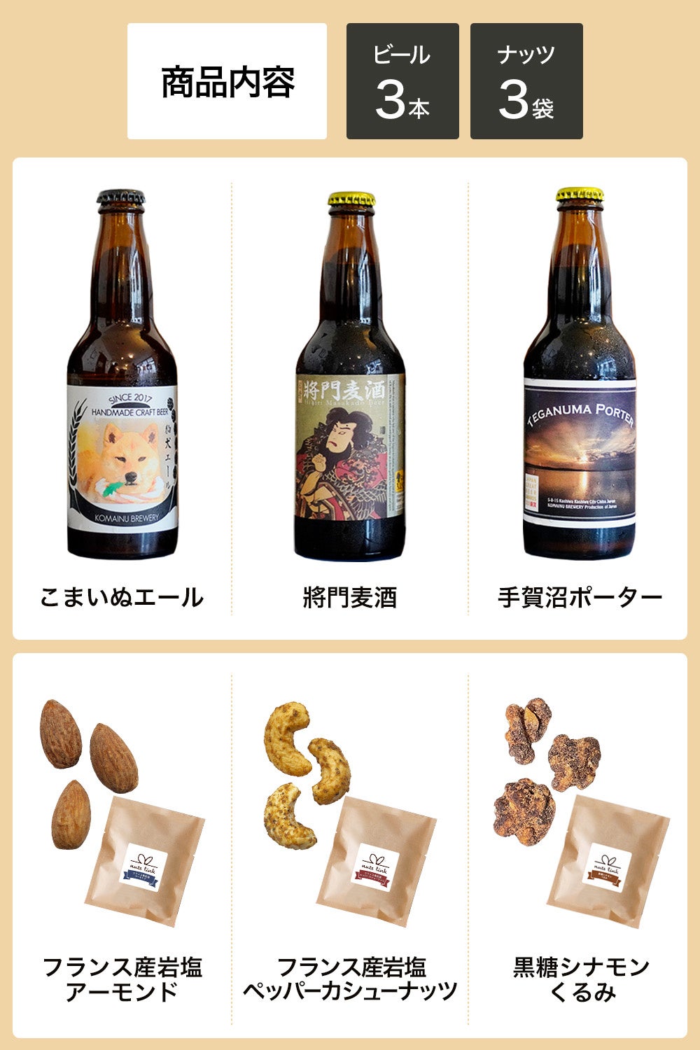 商品内容:クラフトビール3種3本、フレーバーナッツ3種3袋
