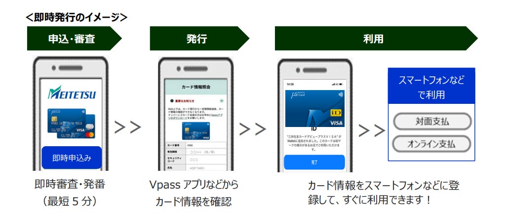 12月12日(月)より、名鉄ミューズカードの即時発行を開始します。スマートフォンなどから申し込み後、最短5分でクレジットカード番号の発行が可能になります。名鉄グループが採用している三井住友カードのオールインワン決済端末「stera terminal」はVisaのタッチ決済/Mastercard®コンタクトレスにも対応しているため、即時発行後、カードをスマートフォンなどに登録することですぐに利用できます。
