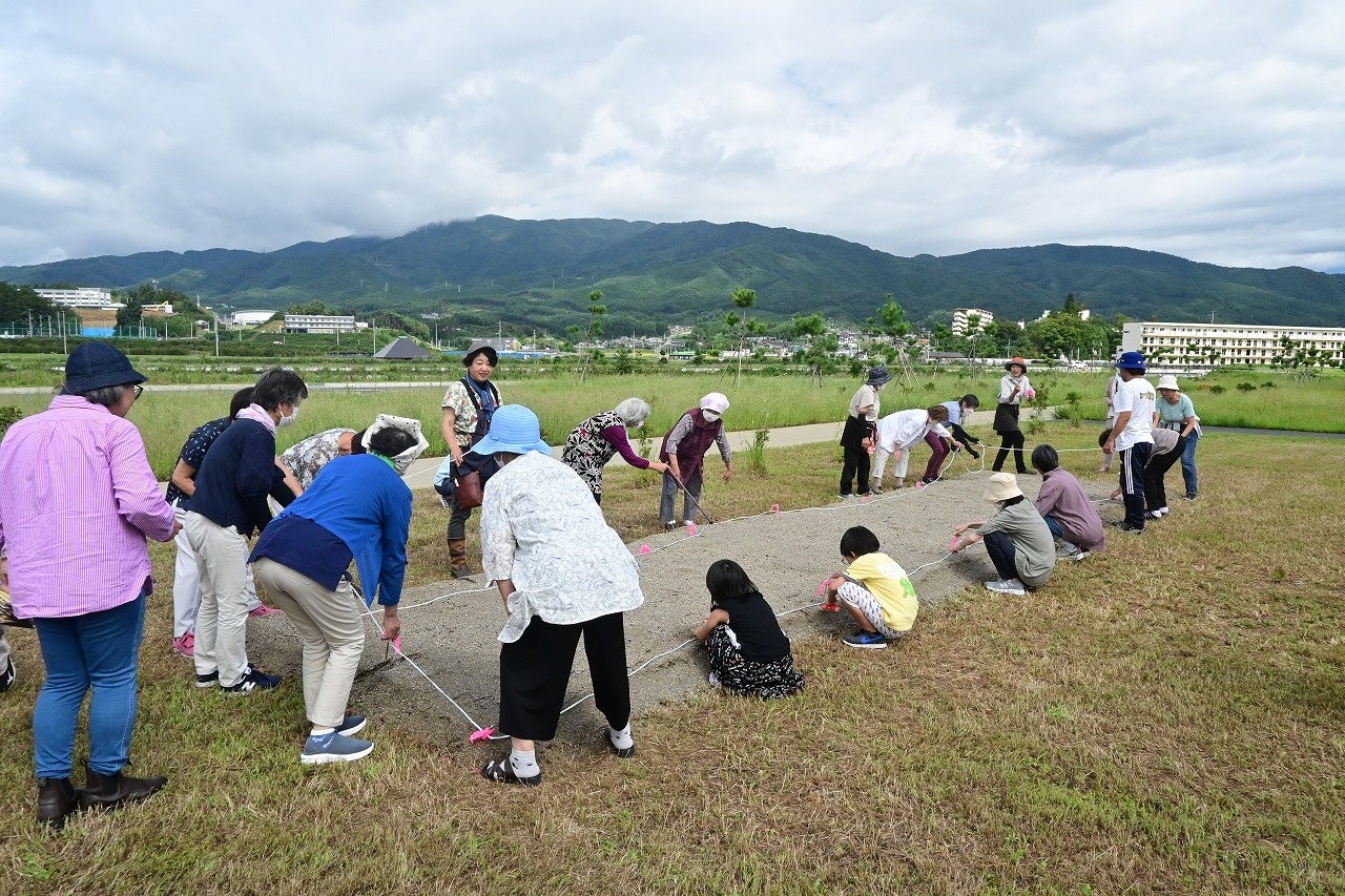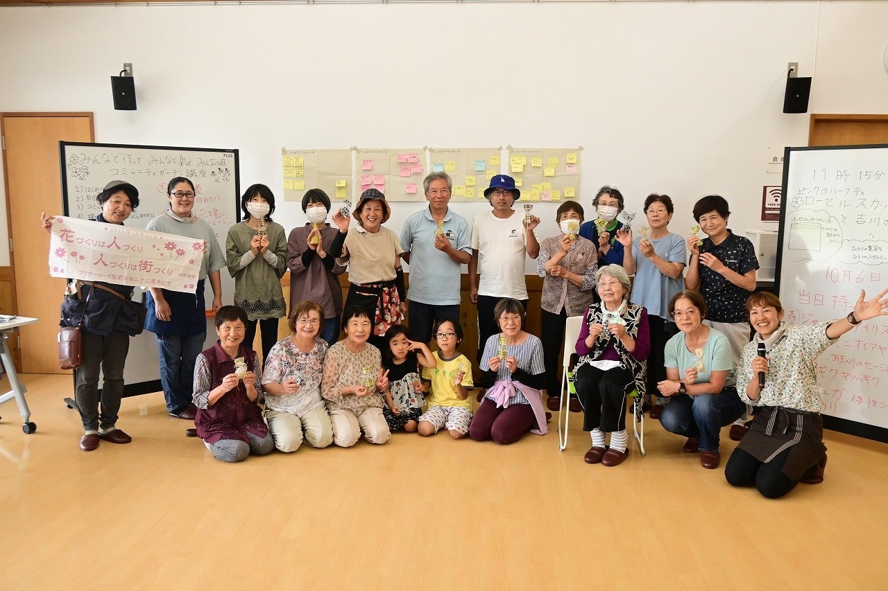 9月16日開催のワークショップにて、現地の環境条件を踏まえ、どんな花壇したいか、どんな花を植えたいかを話し合いました。「勾玉」「松原」「波」「クジラ」など、さまざまな意見を集約し、作業性や今後の拡張性も加味してデザインを決定。ローメンテナンス、ローコストでいつもキレイな花壇を目指します。