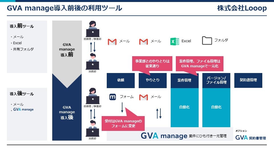 株式会社Looopは、契約書審査や事業部からの相談対応、社内法務研修業務、リスクマネジメントなどを4名の法務担当者で行っています。GVA manage導入前は、法務の案件受付はメールで行い、案件内容をエクセルファイルに手動で転記し、進捗状況もそちらで管理していたため、手間がかかるだけではなく、多数のメールに関連メールが埋もれてしまうことによる案件見落としのリスクも発生していました。マニュアル作業の煩雑さ、案件管理の複雑さなどといった課題を解決すべく、案件管理ツールの導入に向けて複数のツールを比較・検討するなかで、GVA manageの操作性のよさに加えて、依頼フォームで受付し案件を一元管理できることに魅力を感じ、導入していただきました。