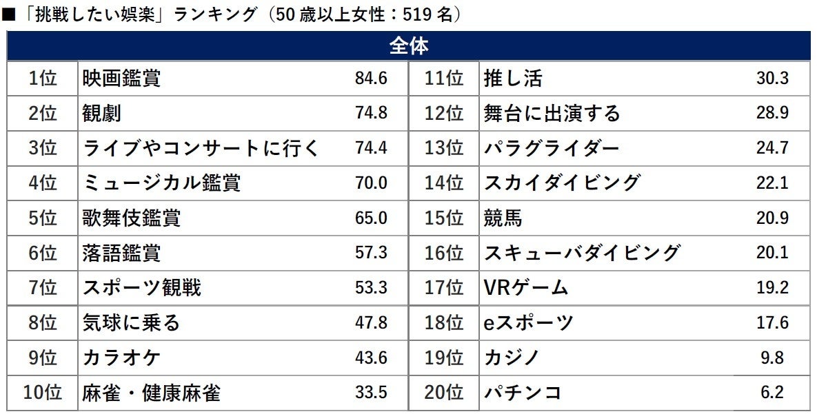 【50歳からのハルメク世代に聞く なんでもランキング】50歳以上の女性が選ぶ「挑戦したい娯楽(遊び・エンタメ)」