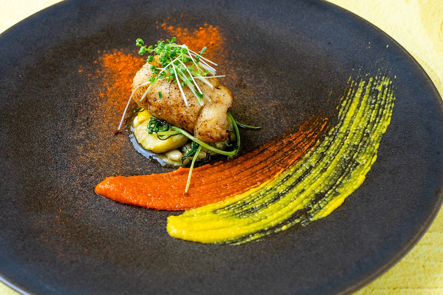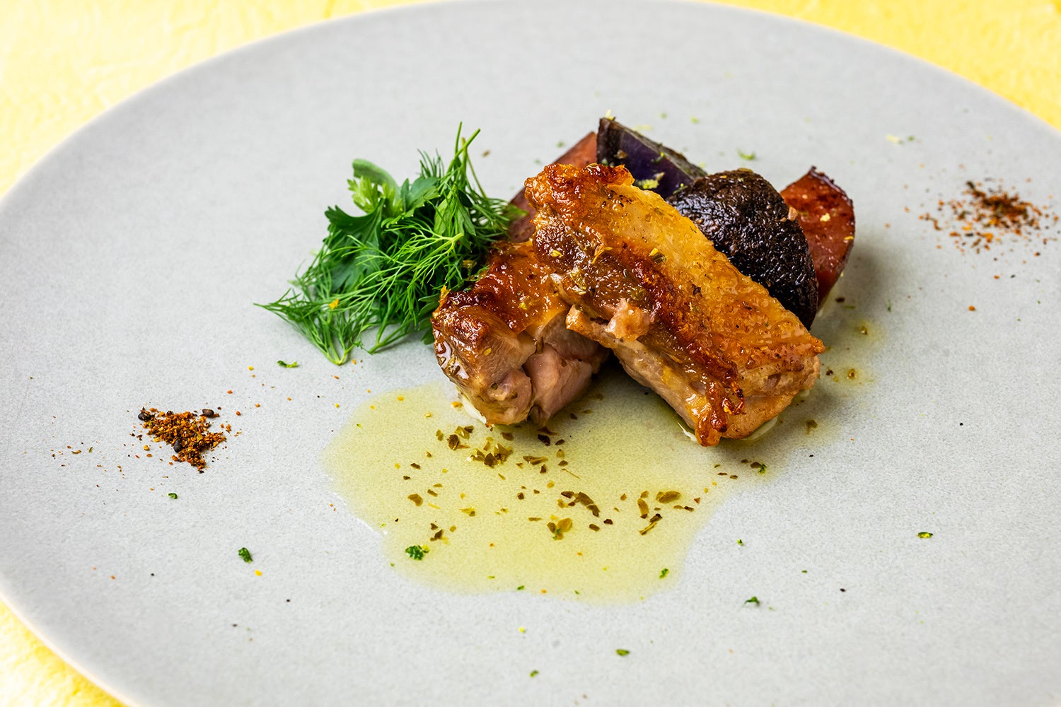 香ばしく焼き上げたはかた地どりに、青柚子と黒七味、和の食材を使用したサルモリッリオを添えて、爽やかで奥深い余韻を。
