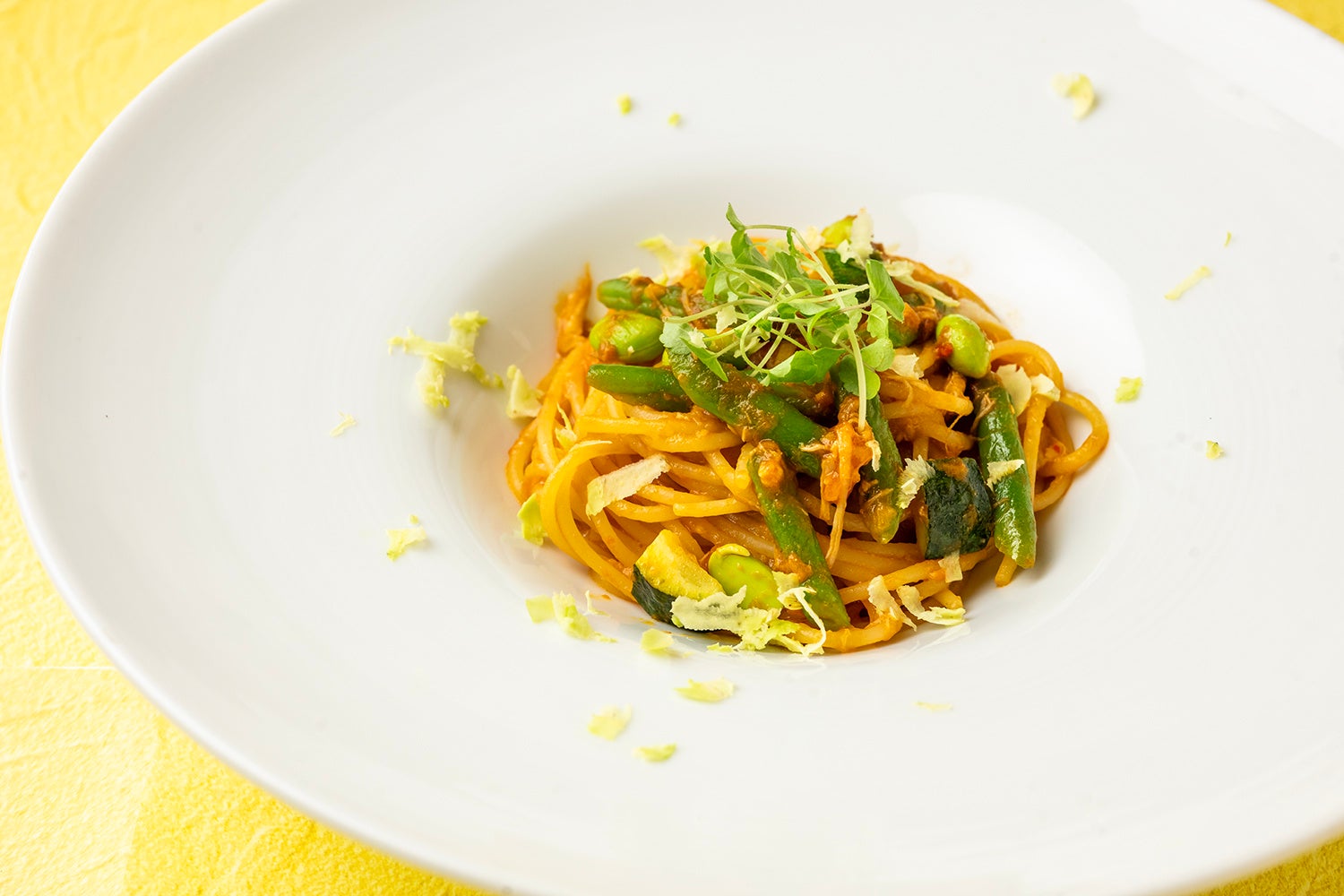 『スパゲッティ 梅肉天龍鶏と旬菜のトマトソース 山葵のアクセント』(ランチ)