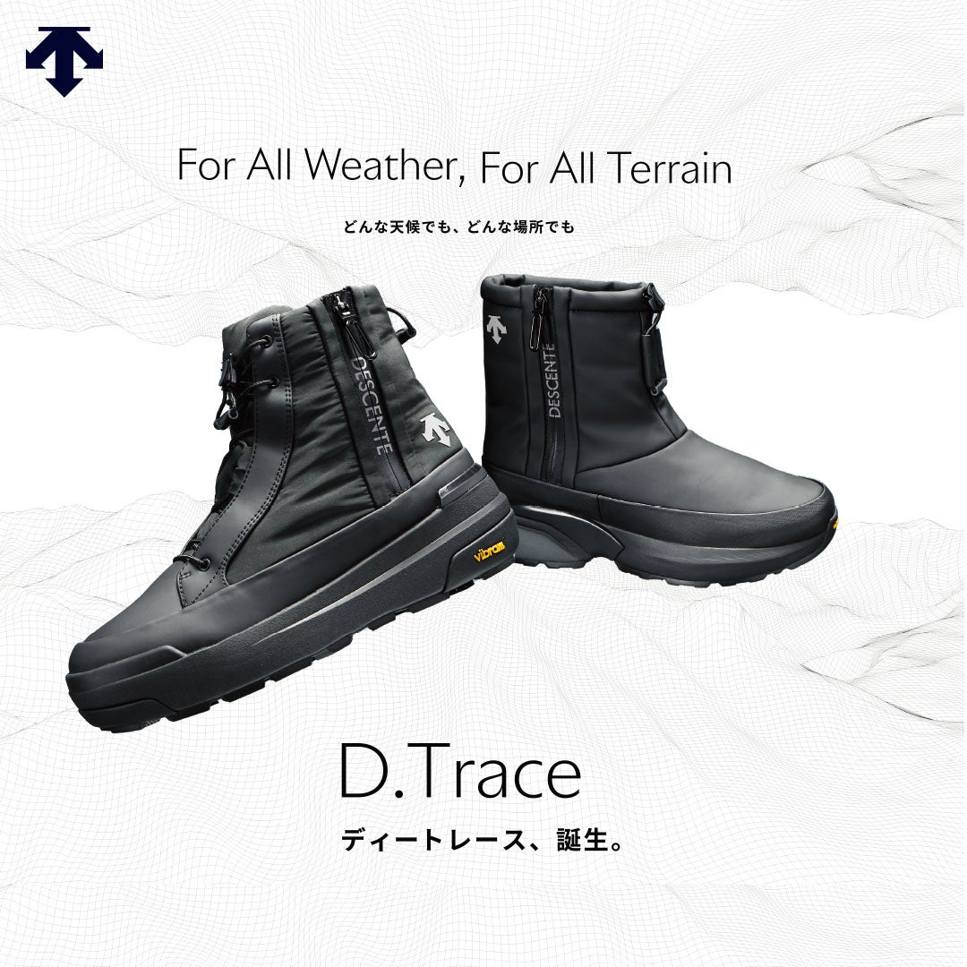 雪や濡れた路面における滑りにくさが重要視されるウィンターブーツにおいて、気候や時間により変化するどのような雪の状態にも適応できる商品を開発できないか、という想いのもと誕生したのが「D.Trace」です。「D.Trace」は雪だけでなく、氷の上でも優れた機能を発揮し、様々な降雪シーンに対応します。さらに、『デサント』らしいスタイリッシュなデザインと、『デサント』独自の機能性、ビブラム社のテクノロジーも搭載されたハイスペックな商品です。