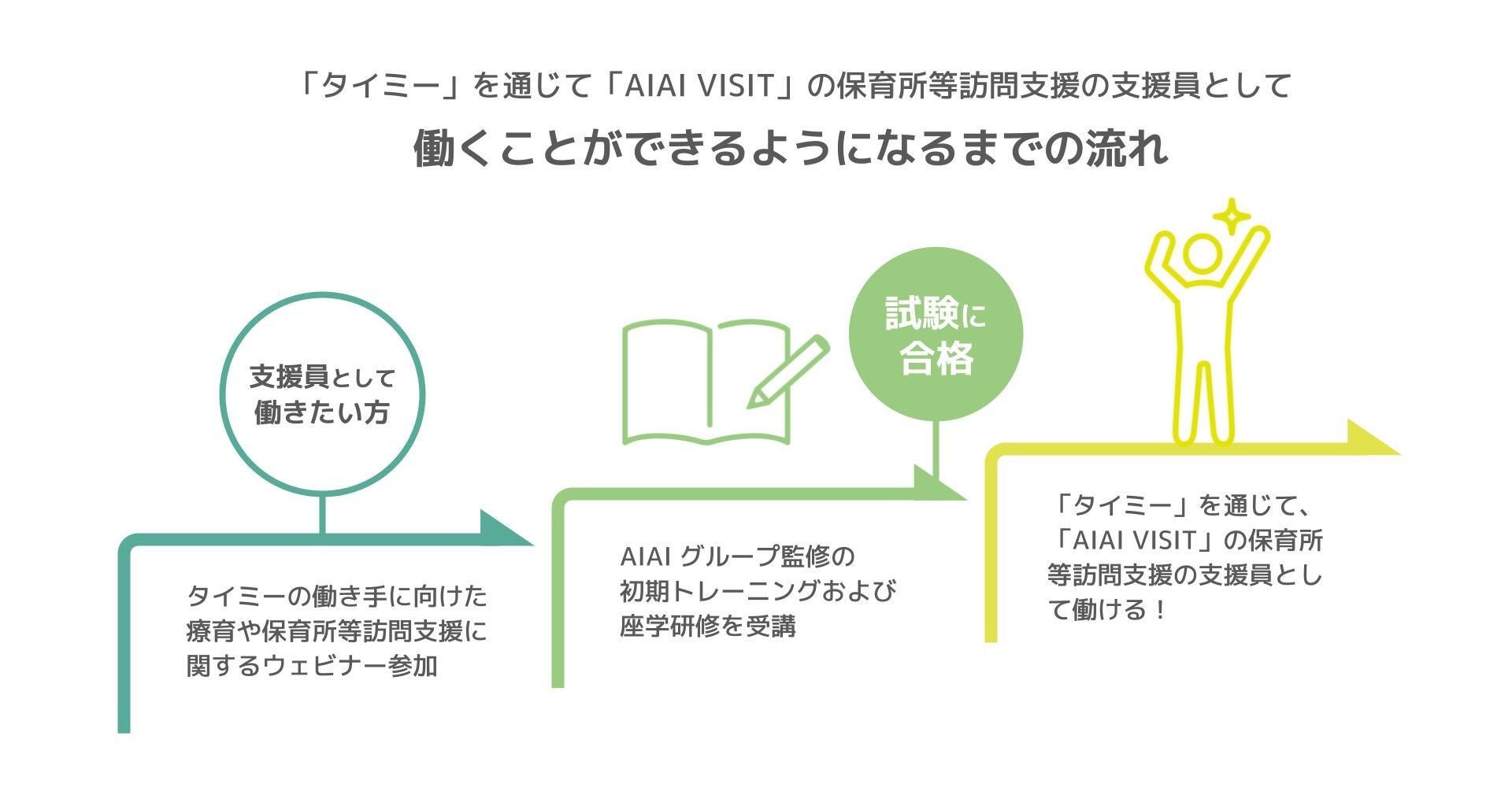 「AIAI VISIT」の保育所等訪問療育支援サービスでは、徹底した初期トレーニングおよび座学研修を受講して試験に合格した人に限り、お子様の支援の場に立つことができます。今回、タイミーとAIAIグループの協力により、保育士資格や作業療法士等の資格を持つ「タイミー」に登録している働き手を対象に、同様のトレーニング研修・試験を行い、専門知識を習得した働き手が、保育所等訪問療育支援サービスの支援員として働ける機会を提供します。また、療育の品質や安全性を担保するため、試験合格後にOJTでオペレーションを確認するほか、AIAIグループが監修した療育の教科書を貸与し、標準化された療育の提供を目指します。
