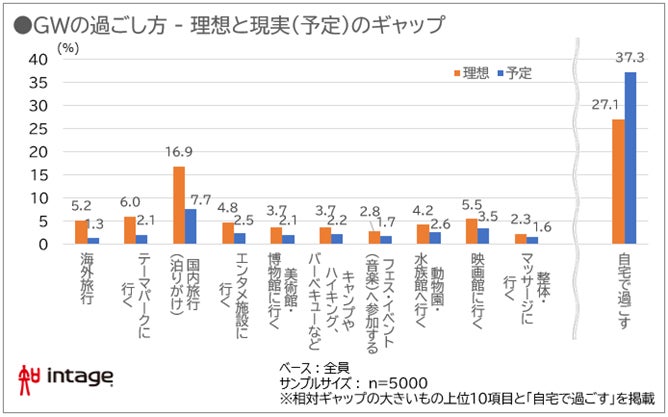・希望する過ごし方と現実の予定は「海外旅行」(4倍)「テーマパークに行く」(3倍)などでギャップあり、現実は厳しい