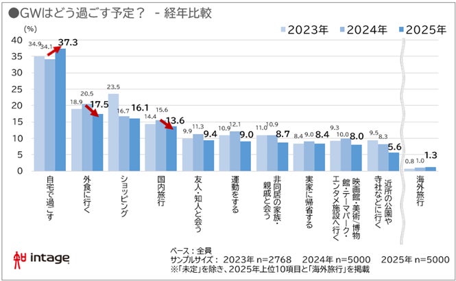 ・予定上位は「自宅で過ごす」(37.3%)、次いで「外食」「ショッピング」「国内旅行」。前年比減の項目が目立つ