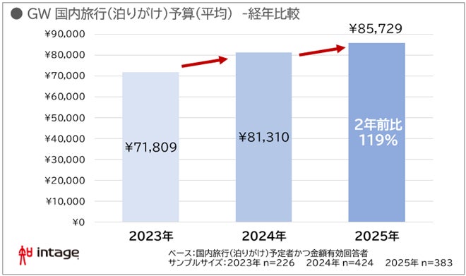 ・国内旅行(泊りがけ)の予算は平均85,729円、物価高影響で増加。家族と旅行する人が多い一方ひとり旅も人気