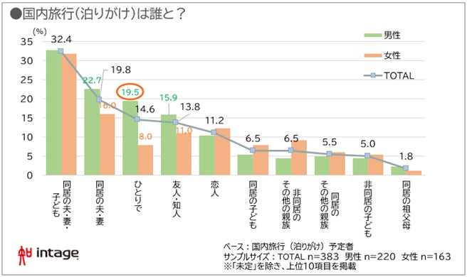 国内旅行(泊りがけ)に関しては、家族(同居の夫・妻・子ども)と一緒に旅行する人が最も多く(32.4%)、ひとりで旅行する人も一定数存在し、前年から2ポイント増加。男性は2割近くが「ひとりで」と回答しました。家族や親しい人との旅行が主流である一方で、ひとり旅の人気も高まっていることが伺え、旅行のスタイルが多様化していることが示されています。物価高やオーバーツーリズムを懸念して、複数人での旅行を回避する傾向もあるかもしれません(図表6)。