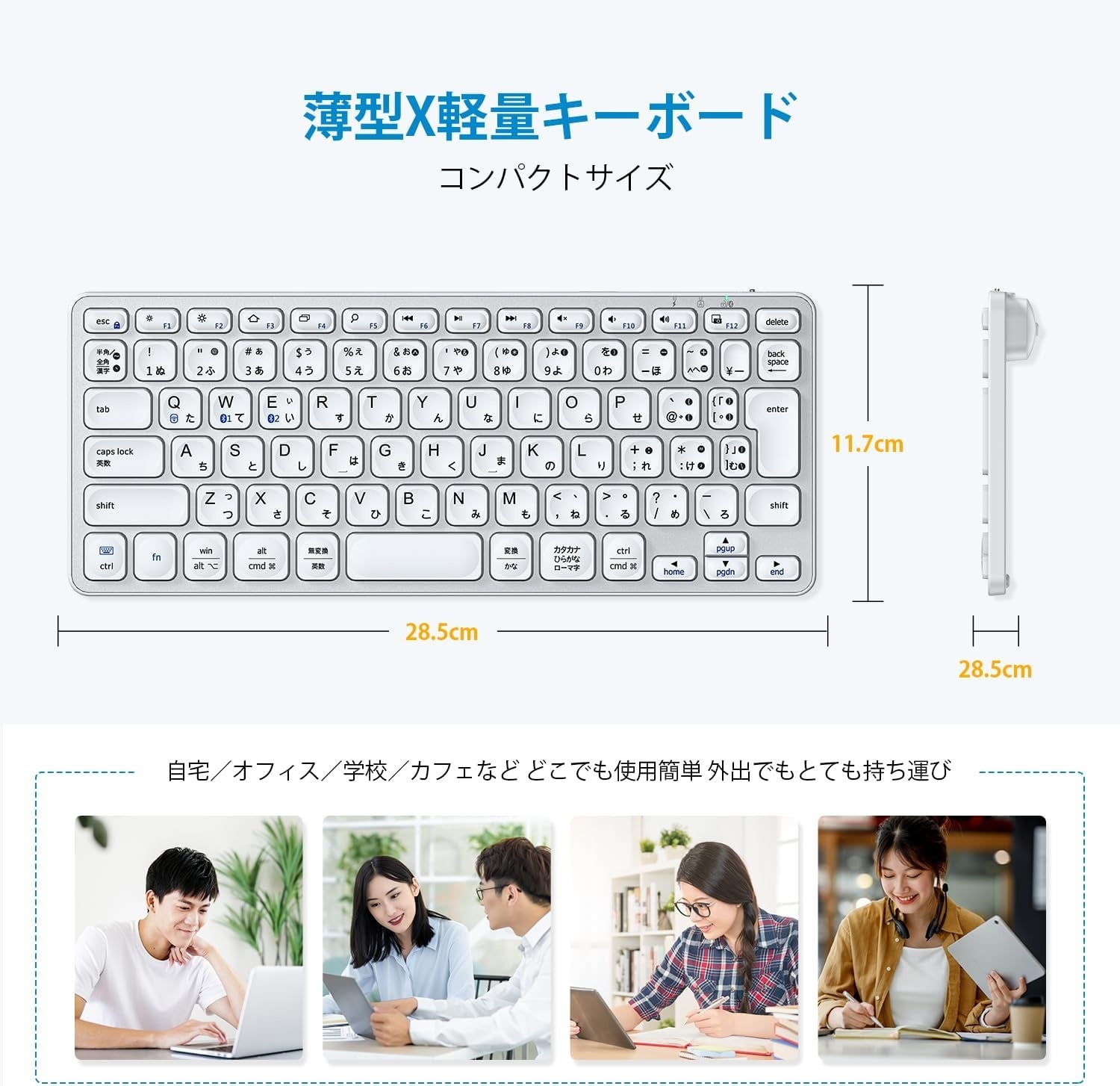 コンパクトなテンキーレスキーボードです。さらに薄型・軽量設計のため、気軽に持ち運ぶことができます。外出先でタブレットと組み合わせれば、まるでノートパソコンで作業しているようです。