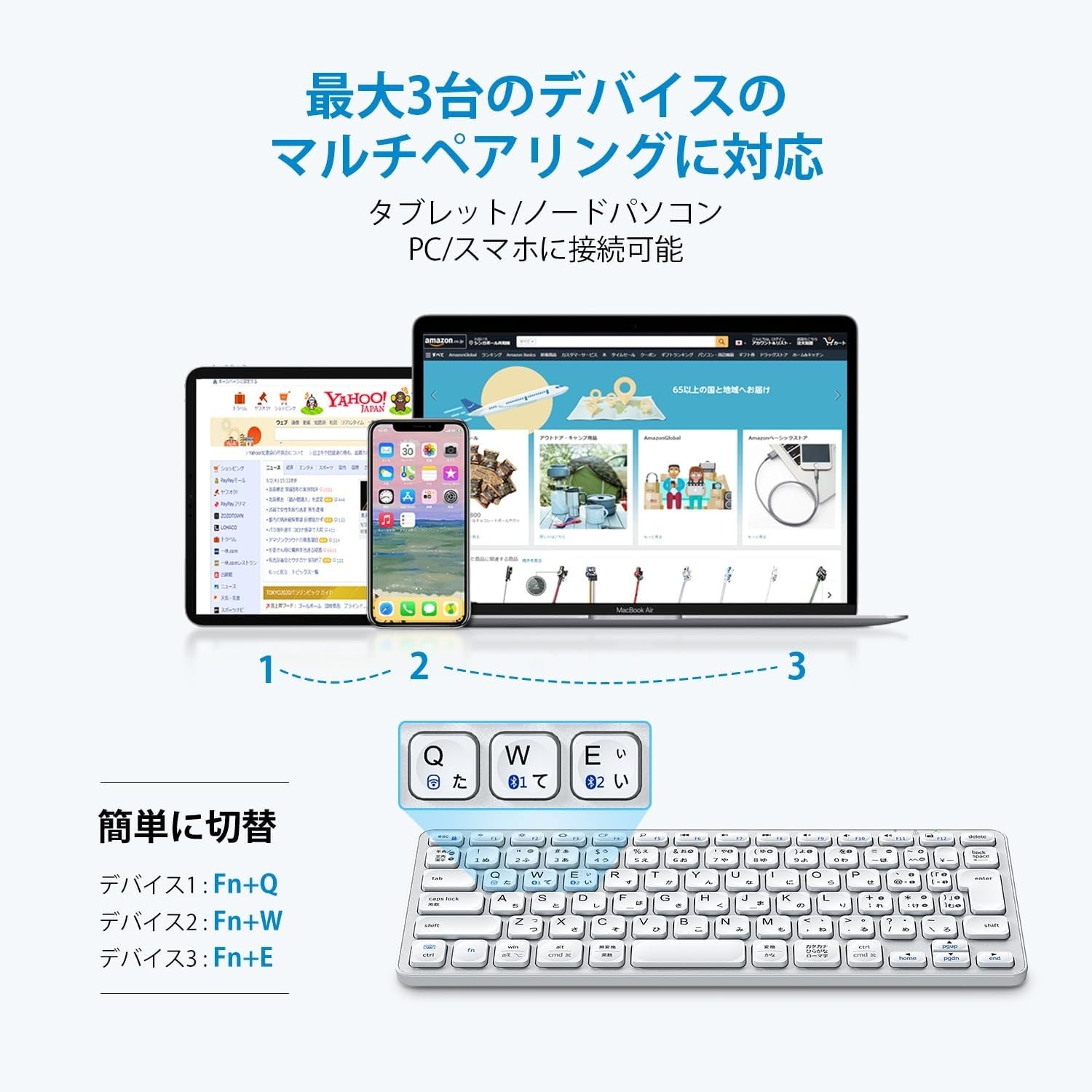 Bluetooth接続と2.4GHz接続に対応しており、最大で3台のデバイスをマルチペアリング可能です。指定のキーをワンタッチすることで瞬時に接続先デバイスを切り替えることができます。