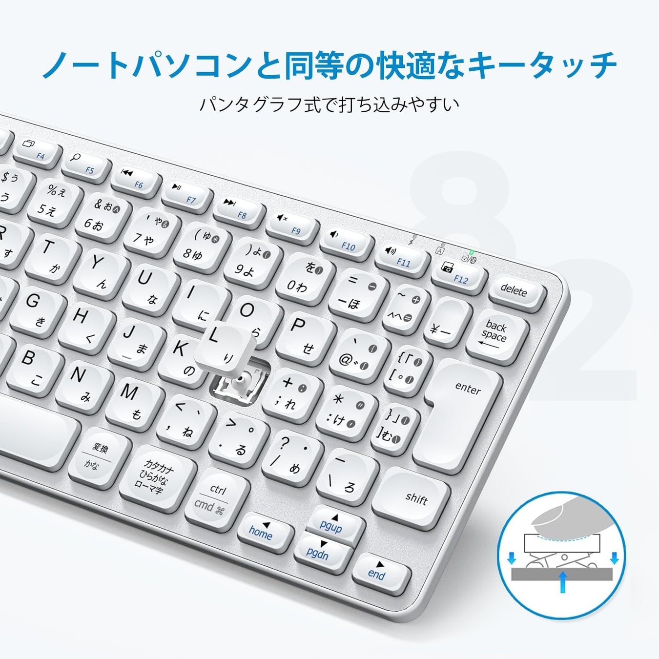 水滴型のキーデザインを採用しており、指が自然とキーのくぼみにフィットします。また、キースイッチはパンタグラフ構造を採用しており、ノートパソコンのような快適な打鍵感を提供します。