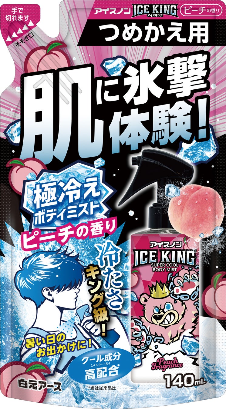 今回発売する『アイスノン ICE KING 極冷えボディミスト ピーチの香り』は、圧倒的なクール感や保湿成分はそのままに、フレッシュなピーチの香りが楽しめます。ラインナップは、本体(内容量150mL)とゴミの量を減らすことができるつめかえ用(内容量140mL)があります。
