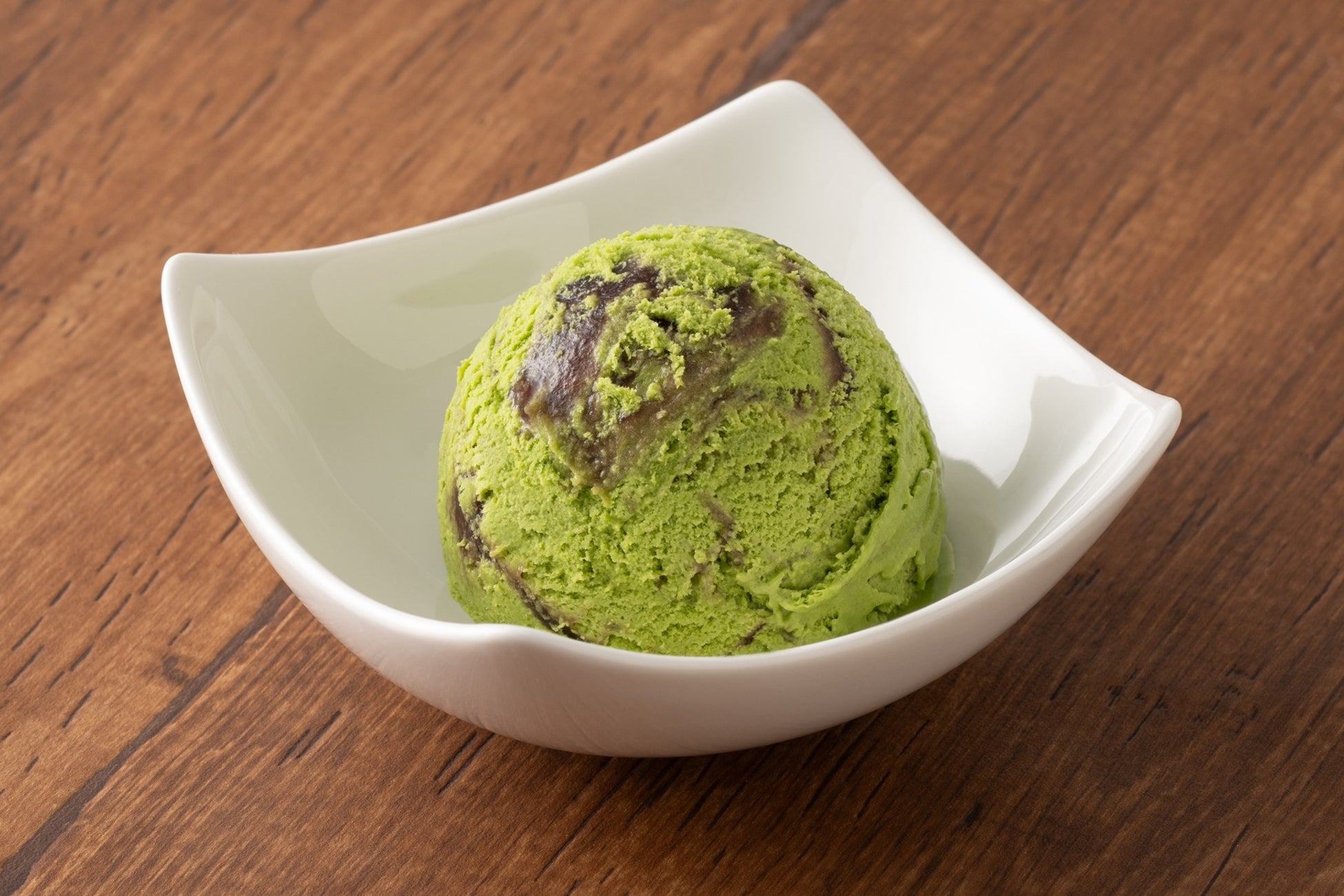 京都府産の石臼挽き宇治抹茶一番茶を使った、抹茶の風味と旨みをしっかり楽しめる色鮮やかな抹茶アイス。北海道産小豆を使用したこしあんをマーブル状に混ぜ合わせることで、甘味のアクセントとなり味の変化も楽しめます。