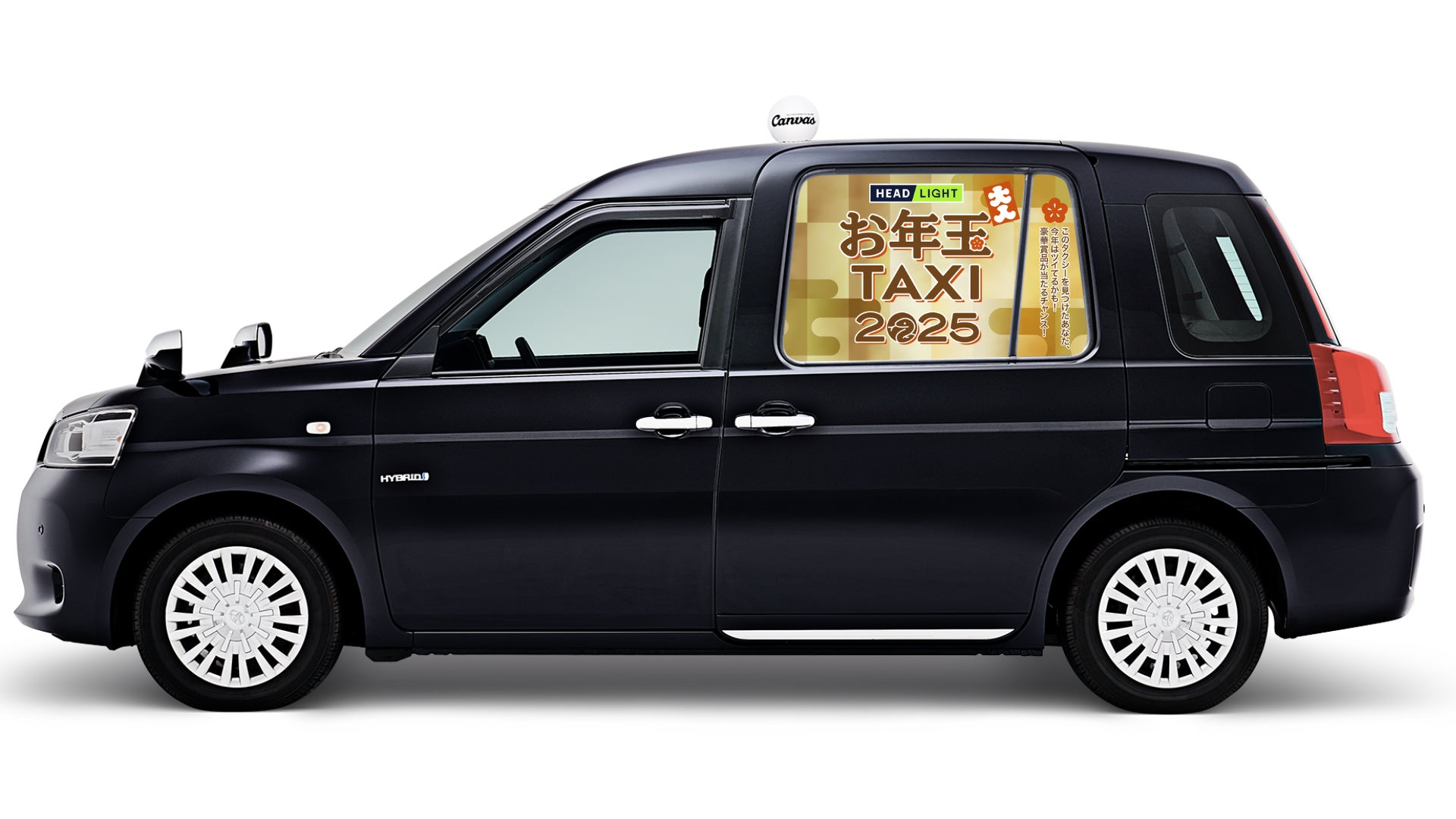 モビリティプラットフォーム事業を展開する株式会社ニューステクノロジー(本社:東京都港区、代表取締役:三浦純揮、以下ニューステクノロジー)とタクシーアプリ 「S.RIDE®(エスライド)」を提供するS.RIDE株式会社(本社:東京都港区、代表取締役:橋本洋平、以下S.RIDE)は、両社が運営するモビリティ車窓メディア「THE TOKYO MOBILITY GALLERY Canvas」(以下「Canvas(キャンバス)」)を活用したタクシー利用者への還元企画として、1月1日(水)〜1月12日(日)の期間限定で「お年玉タクシー2025」が走行することをお知らせします。本タクシーでは、移動時間の情報番組「HEADLIGHT」公式Xで開催予定の豪華商品が当たるお年玉キャンペーン情報の放映や、乗車記念ステッカーもお渡しします。