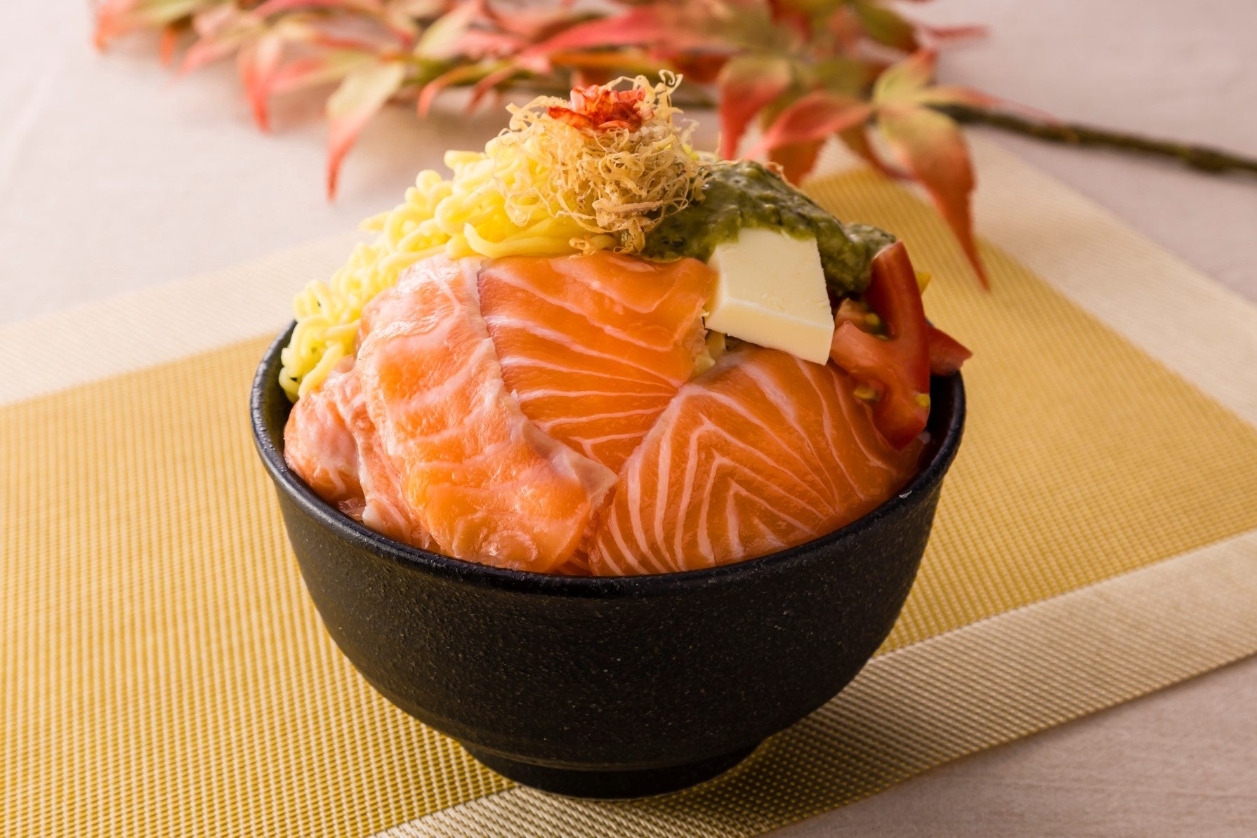 たっぷりのサーモンに、トマト、そば、ジェノベーゼソース、バターなどをトッピングした洋風もんじゃです。