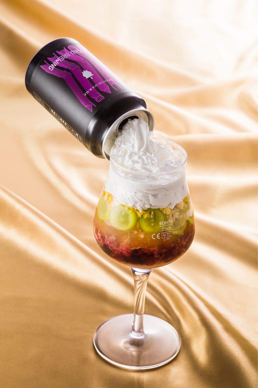 栗、りんご、シャインマスカットなど秋の味覚をつめこみ、ホイップをビールに見立てました。