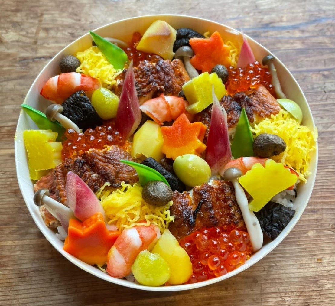 うなぎ、海老、イクラなどの海鮮や銀杏などが入った秋の味覚が満載なちらし寿司です。