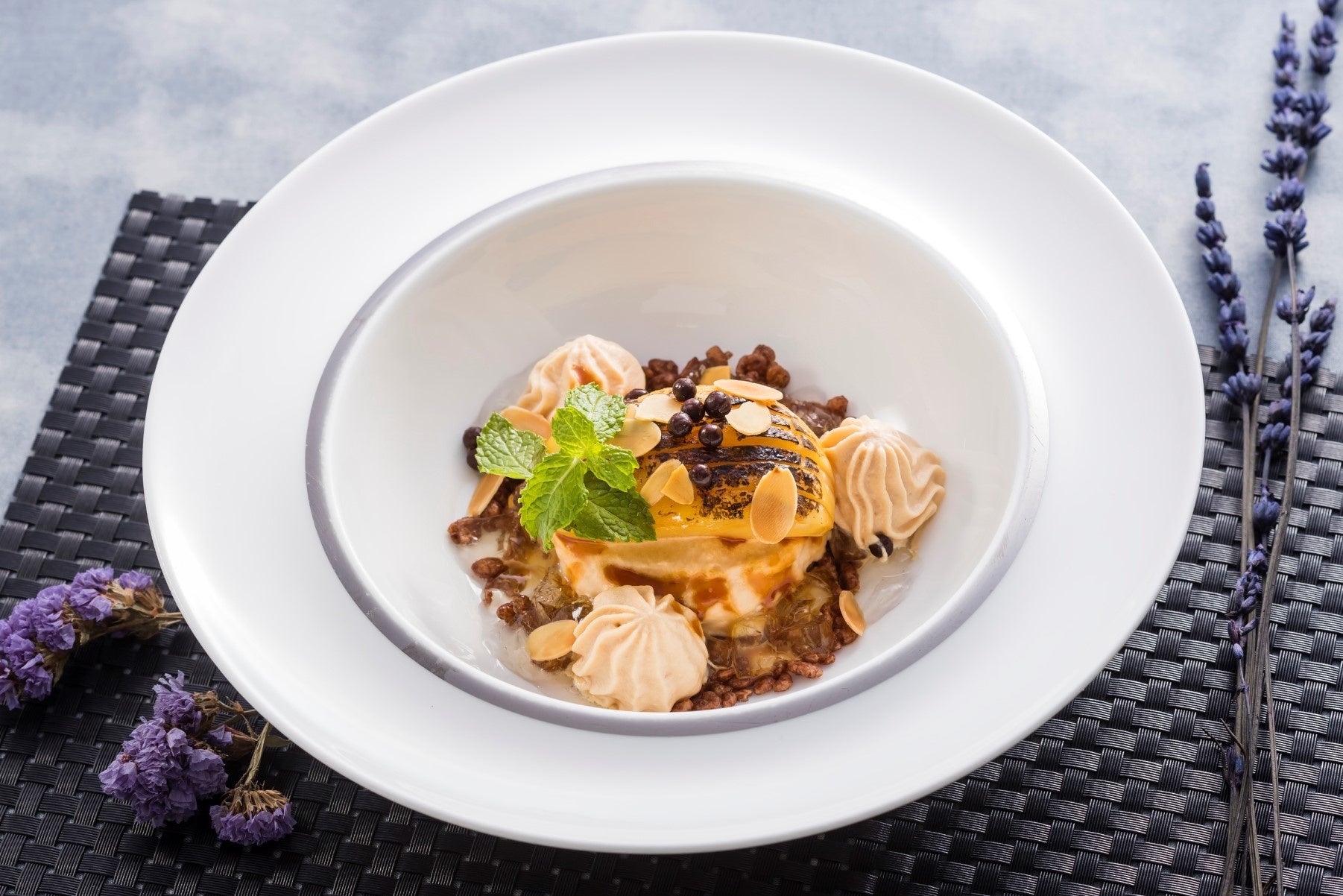 キャラメルアイスクリーム・キャラメルのエスプーマ・ラフランスのゼリー・ラフランスのコンポート・ナッツ・チョコクリスピーが詰まった贅沢なパフェです。