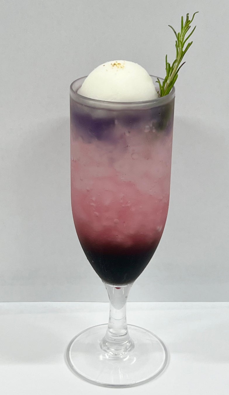 レモンフレーバーのソーダと巨峰シロップのグラデーションがきれいなジュレソーダ。りんご味のプルプルジュレの食感も楽しい!爽やかなレモンジェラートとの相性も抜群です。