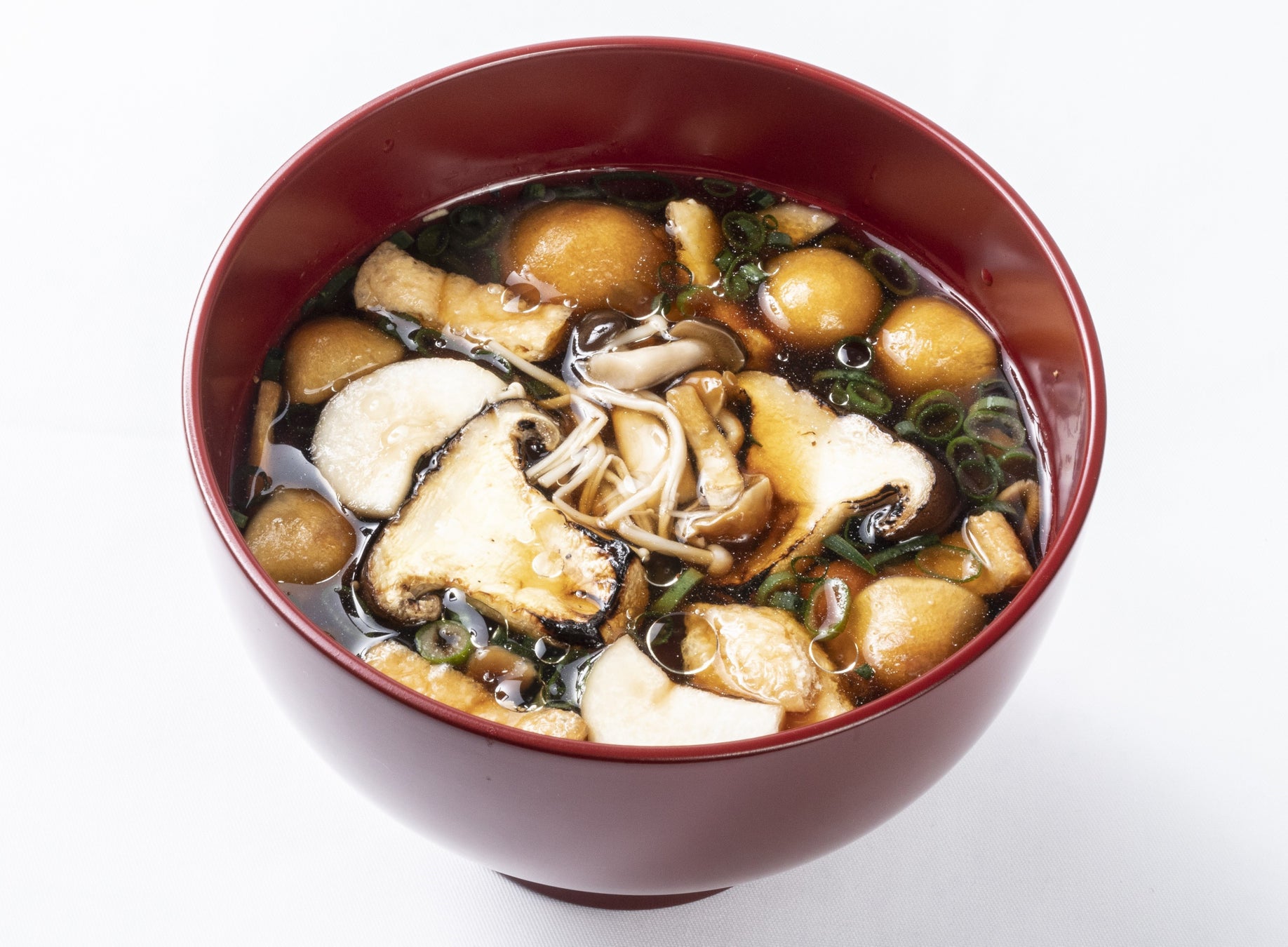 しめじ・えのき・なめこ・エリンギ・舞茸など、きのこがたくさん入ったおみそ汁に、直火で炙った丹波の大黒本しめじを後載せ。仕上げには白トリュフオイルを使用しています。