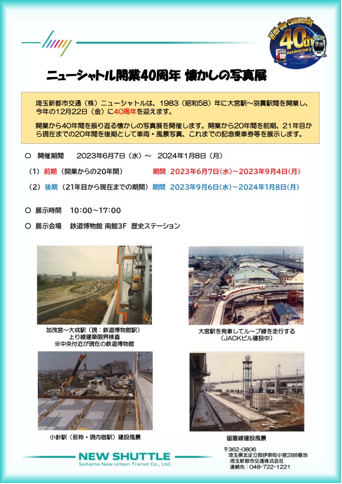 ※「ニューシャトル開業40周年 懐かしの写真展」のデジタルスタンプ取得には、「鉄道博物館」の入館料金が必要です。(開館時間と休館日は鉄道博物館のホームページをご確認ください。)