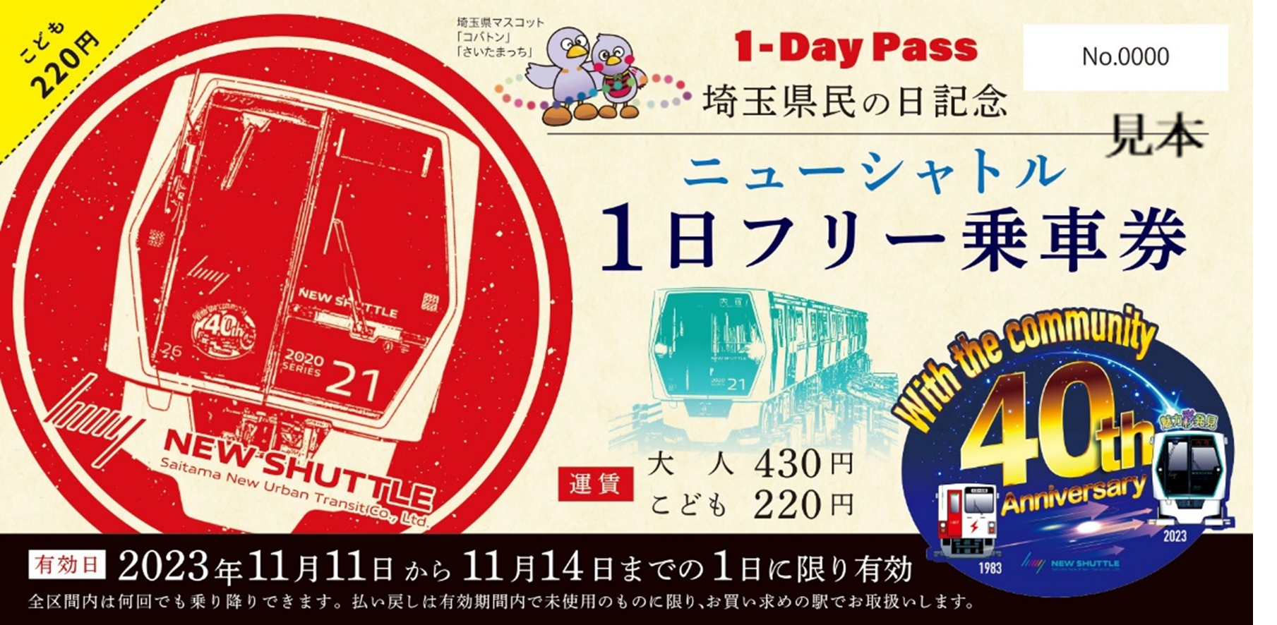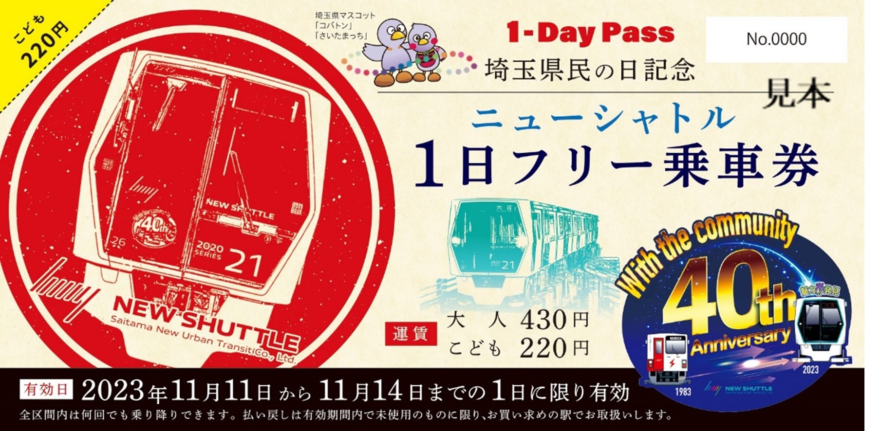 ニューシャトルでは、埼玉県民の日を記念して、11月11日(土)~11月14日(火)の4日間のうち1日限り有効の「埼玉県民の日記念ニューシャトル1日フリー乗車券」を発売いたします。今年は11月14日(火)の「埼玉県民の日」を有効期間に含んだ乗車券となっております。