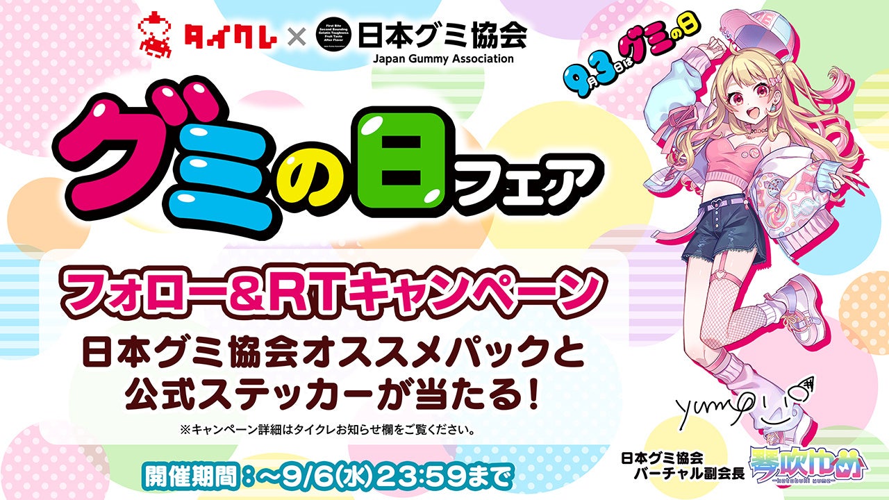 タイクレX(旧Twitter)アカウントにて、「日本グミ協会オススメパック6種をプレゼント!フォロー&リポスト(リツイート)キャンペーン」を開催いたします。詳細はキャンペーン開始後タイクレ内お知らせ欄をご確認ください。