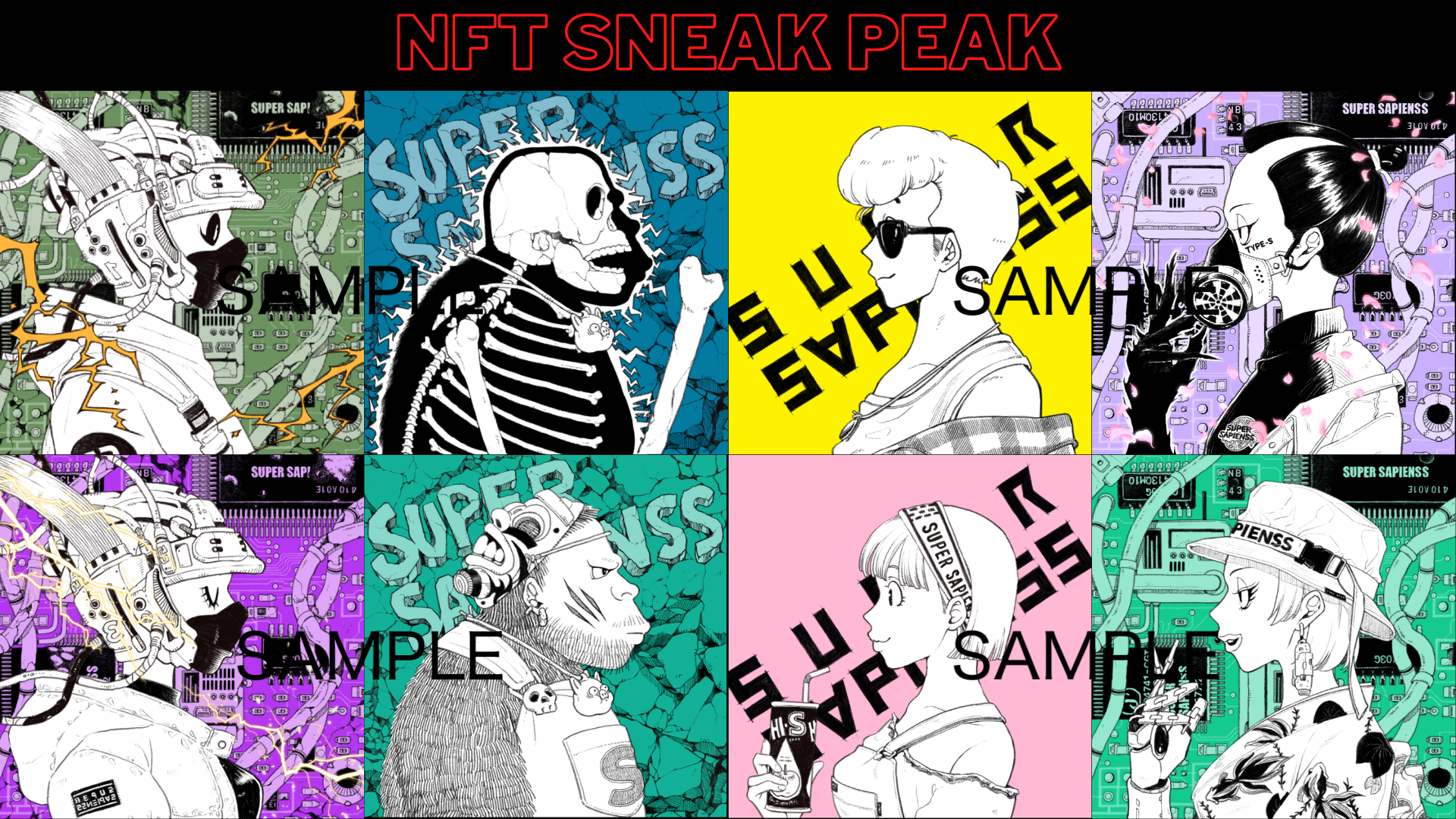 2022年9月26日より始動したSUPER SAPIENSS NFTのクリエイティブは、堤監督のオリジナルキャラクター案をもとに、SUPER SAPIENSSのWEBTOONを手掛ける漫画家のちょび氏が原画開発しています。クリエイティブは、世界が注目するジャパンカルチャーが詰まった内容になっています。