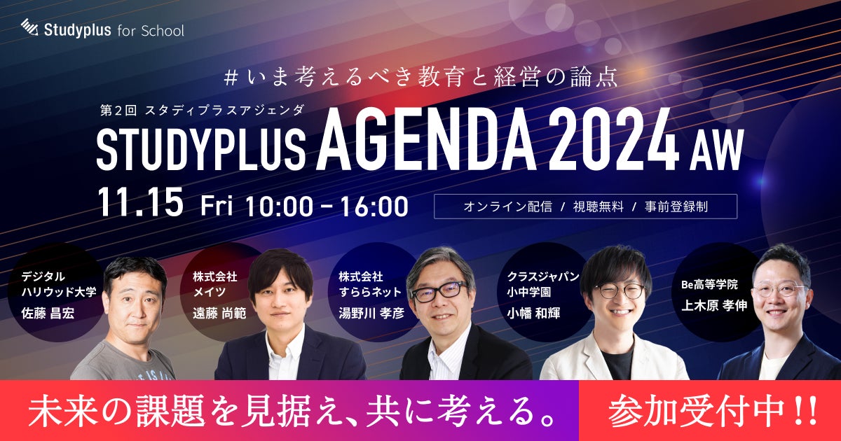 教育機関向けコミュニケーションプラットフォーム「Studyplus for School」を提供するスタディプラス株式会社(本社:東京都千代田区、代表取締役:廣瀬高志、以下スタディプラス)は、2024年11月15日(金)に開催するオンラインイベント「Studyplus Agenda 2024 AW~いま考えるべき教育と経営の論点~」の後半セッションのテーマと登壇者を発表いたします。
