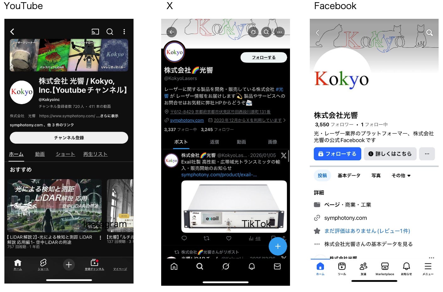光響では、レーザー・光関連製品や技術情報、展示会やイベントの様子、日々の取り組みなどを、公式SNSを通じて発信しています。新たに開設したTikTokでは、短尺動画の特長を活かし、製品や技術のポイントを分かりやすくご紹介するコンテンツの発信を予定しています。