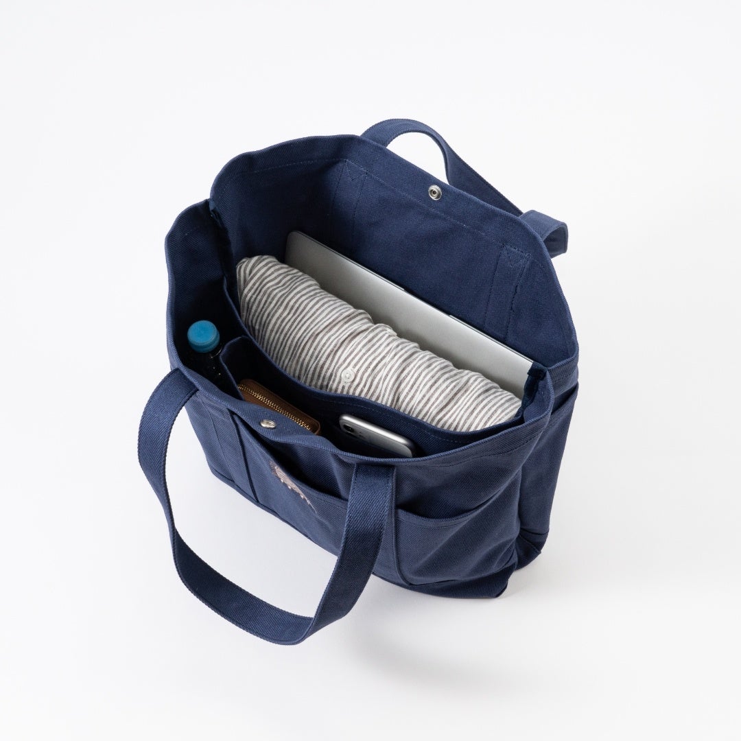 ポケットや仕切りがたっぷり備わった、A4サイズ対応のトートバッグ。帆布より厚みのある綿ツイルで作られており、しっかりとした丈夫な厚みです。