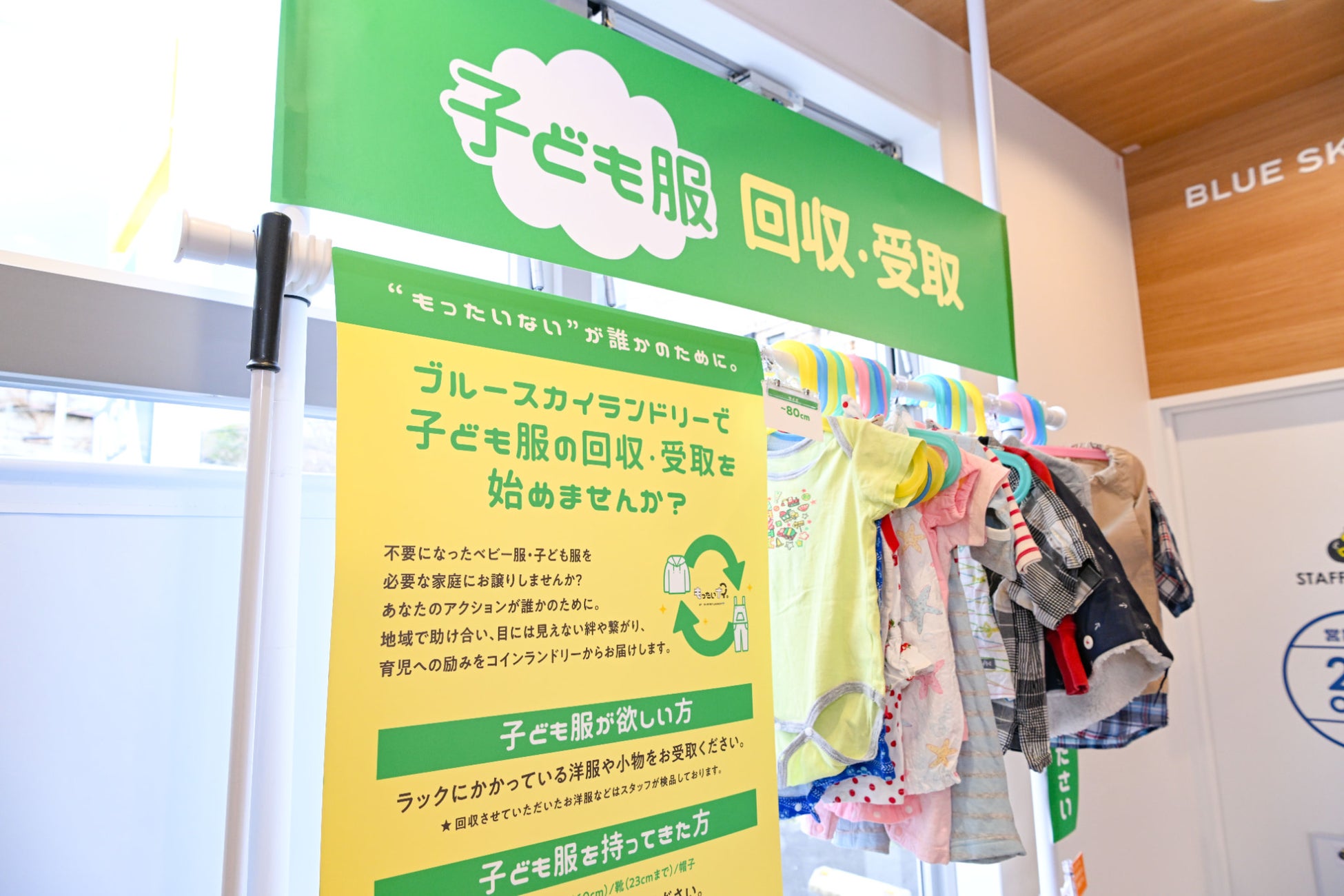 ブルースカイランドリーは、不要な子ども服を回収し、必要とする家庭に無料で提供するリユース活動を行っており、2024年8月末現在全国89店舗にリユースブースが設置されています。