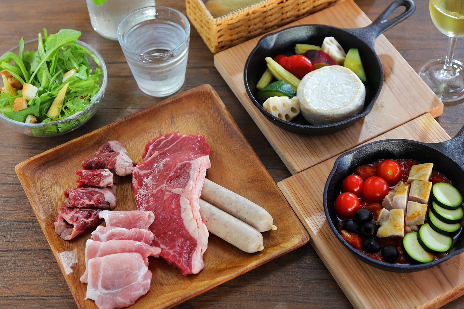 食事は通年人気の「グランピングBBQプラン」や期間限定の「メキシカンBBQプラン(夏期限定)」をご用意致します。メニューは甲州富士桜ポークなどご当地食材や地元の農産物など厳選食材を使用した多彩なラインナップ。