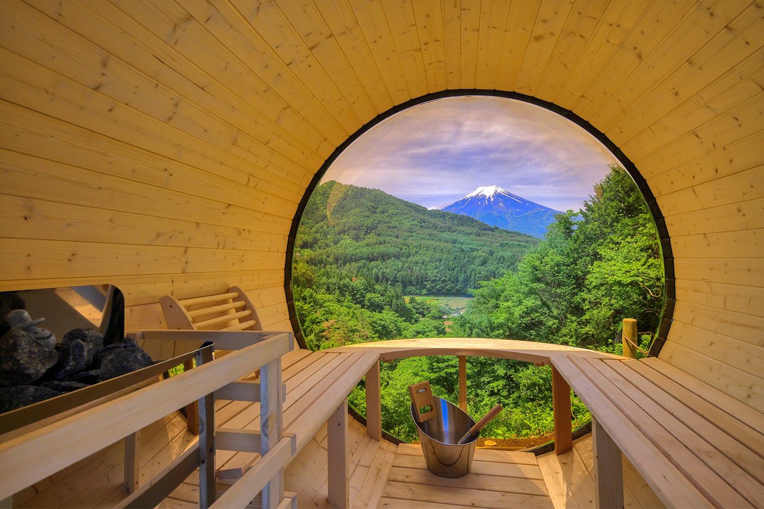 また、近年流行りのアウトドアサウナ。杓子山ゲートウェイキャンプからの絶景のもとサウナができれば…とのお声も多く頂いておりました。円形の特徴的なフォルム。室内も絶景を楽しめるバレルサウナをご用意しました。プライベートな貸切空間でセルフロウリュ。爽快な富士山を眺めつつ外気浴。1日2組限定、杓子山ゲートウェイキャンプならではの極上のととのう体験をお楽しみ頂けます。