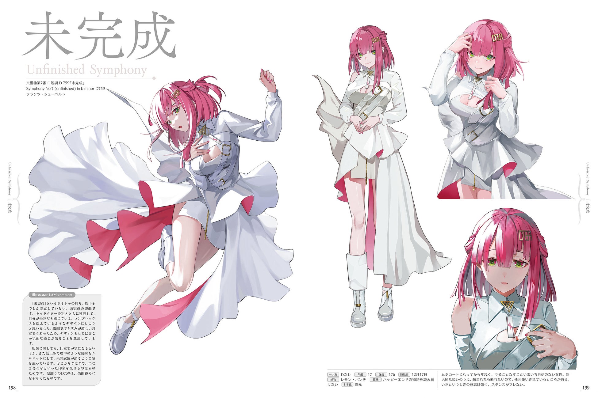 LAM氏と制作スタッフによるデザイン・制作秘話なども掲載している他、未実装に終わったムジカートたちや、メインストーリー"第二部"に向けて準備が進められていたムジカート、ストーリーイラスト、背景コンセプトアートなども特別に本書で初公開しています。さらに作品を彩ったキービジュアルや各種プロモーションイラスト、コラボレーション記念のビジュアル、情感あふれる音源楽装のイラストなど幅広く掲載。総ページ数320ページに、実に1870点越えの図版を展開しています。