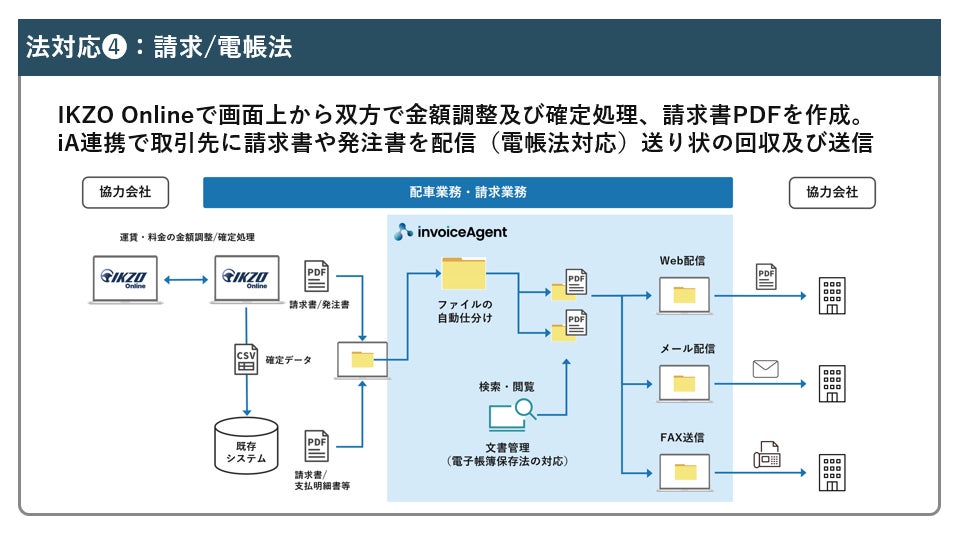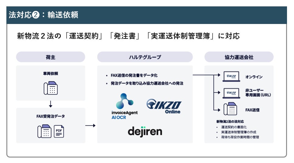 新物流二法で義務化される運送契約の書面化(電子化)や実運送体制管理簿の作成について、物流DXプラットフォーム「IKZO Online」、運送会社向け経営分析システム「IKZO Analytics」、高精度な文字認識で帳票をデータ化する「invoiceAgent AI OCR」、AIプラットフォーム「dejiren」を活用した実証を行いました。 本取り組みは、DX経営による中小運輸事業者支援と積極的な補助金活用のサポートを実施するため、一般社団法人運輸デジタルビジネス協議会と一般社団法人サスティナビリティ・DX推進協議会と連携しています。実証では受信したFAXを自動的にPDF化し、各種システムと連携させることで、最終的にCSVデータとしてIKZO Online、IKZO Analyticsに自動格納させることに成功し、利用する物流事業者側の業務効率化、業務情報の統合と分析高度化による業務改善の観点で、有意な成果が得られました。