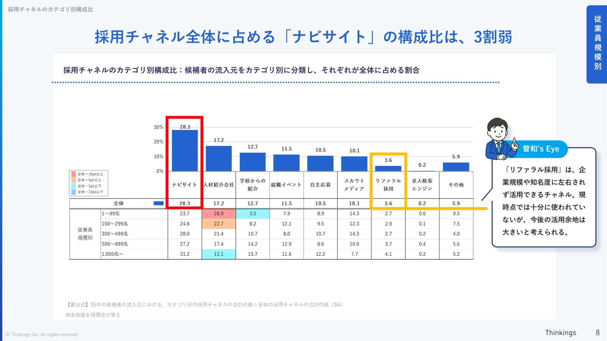 sonar ATSに登録された採用チャネル(候補者の流入元)を、9カテゴリで集計しました。結果として、採用チャネル全体に占める「ナビサイト」の構成比は、3割弱となりました。さらに、「リファラル採用」は企業規模に関係なく利用可能なチャネルであるにもかかわらず、いずれの規模でも十分に活用されていないことが明らかになりました。