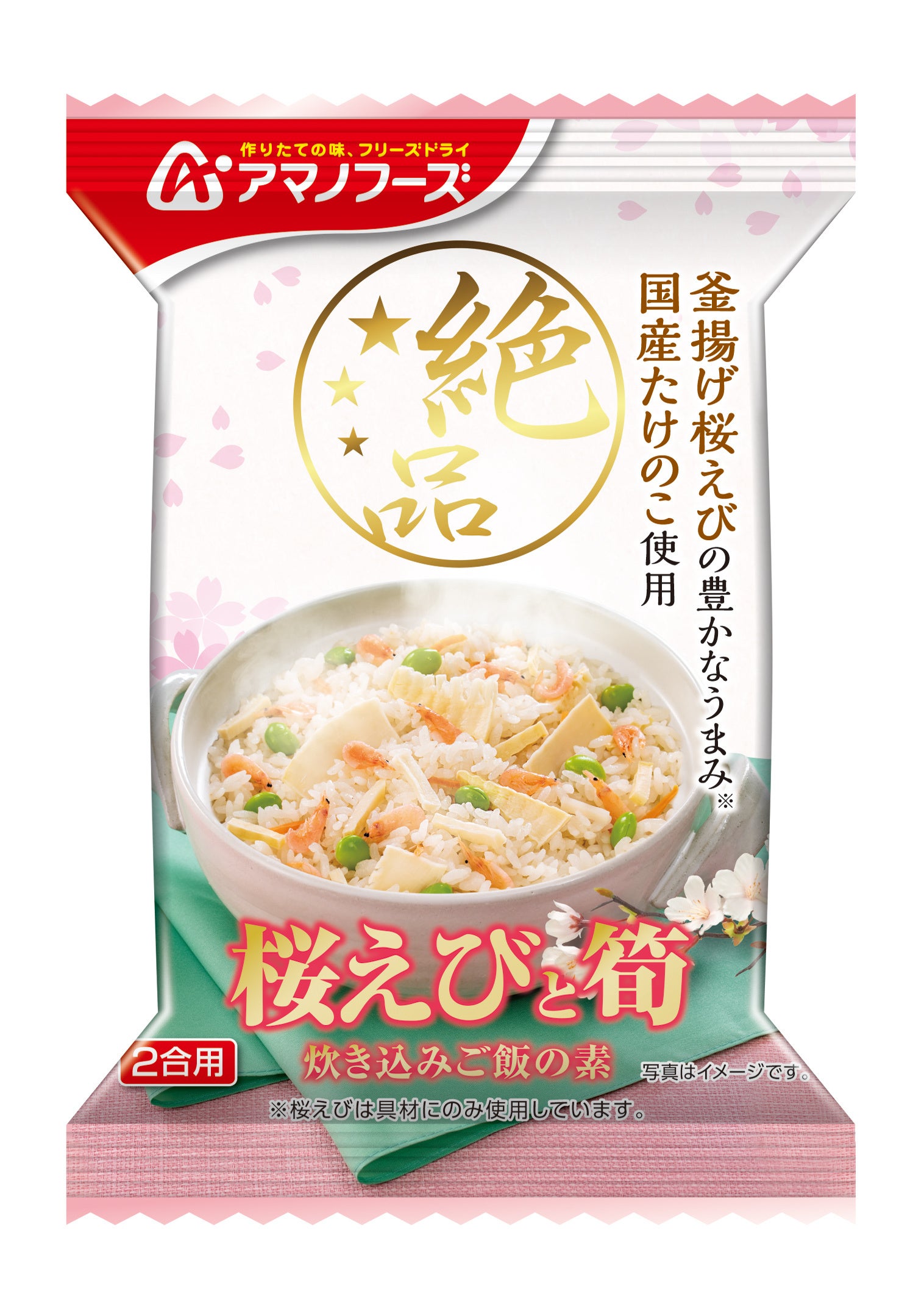 ・釜揚げにすることで濃厚な旨みと香りを引き出した桜えびと、“シャキシャキ”食感の国産たけのこを使用した炊き込みご飯の素です