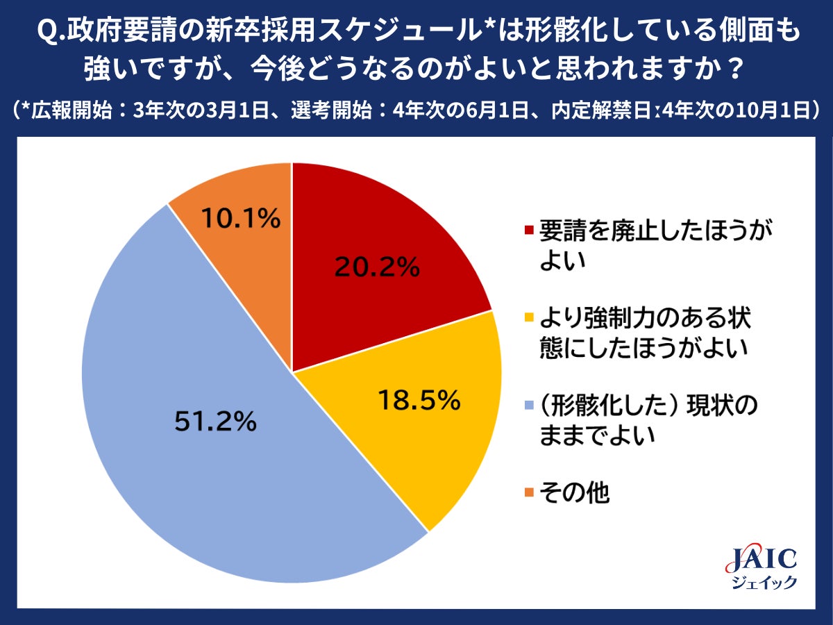 25年卒業学生に「政府要請の新卒採用スケジュール(※)は形骸化している側面も強いですが、今後どうなるのがよいと思いますか?」と質問したところ、「(形骸化した)現状のままでよい」が最多で51.2%、次いで「要請を廃止したほうがよい」が20.2%、「より強制力のある状態にしたほうがよい」が18.5%、「その他」が10.1%となりました。「現行のままでよい」の回答が半数となったほか、現行のスケジュールに何かしらの変更を求める回答は合わせて約4割となりました。
